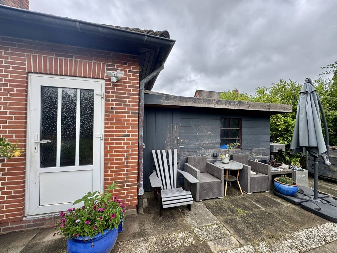 Besonders hervorzuheben ist der liebevoll angelegte Garten mit überdachter Terrasse – perfekt für entspannte Stunden im Freien. Ein praktischer Schuppen sowie die Garage bietet zusätzlichen Stauraum für Gartengeräte oder Fahrräder.