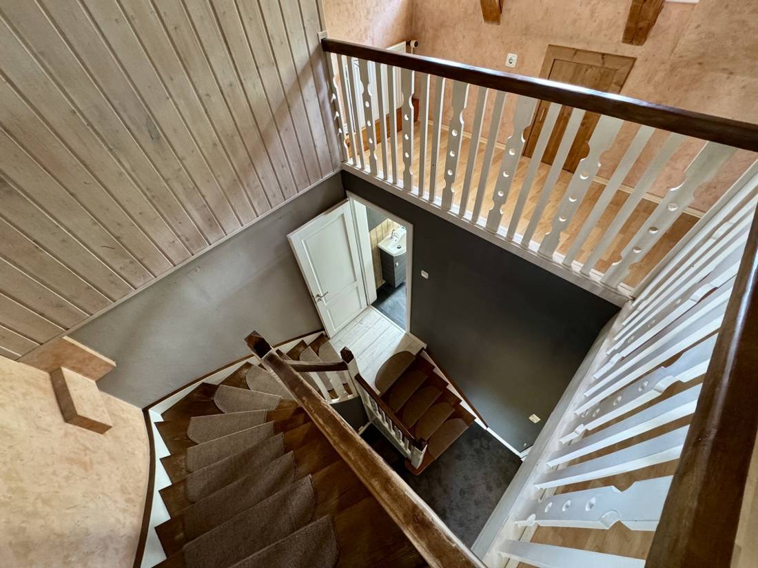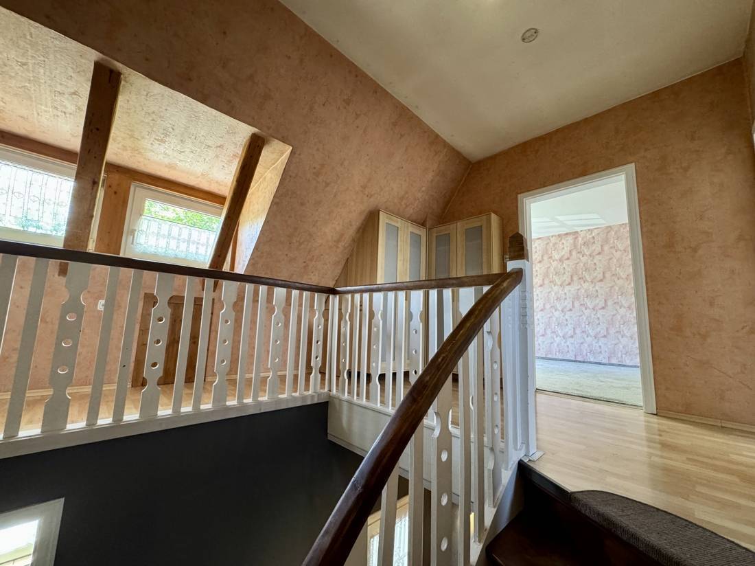 Über eine elegant geschwungene Treppe gelangen Sie ins Dachgeschoss, wo ein großzügiger, offener Flur zu zwei charmanten Zimmern führt. Eines davon wird derzeit als Ankleidezimmer genutzt, lässt sich aber ebenso gut als Büro oder Gästezimmer gestalten. Ein stilvolles Wannenbad sowie ein kleines Gäste-WC auf halber Höhe ergänzen den Wohnkomfort.