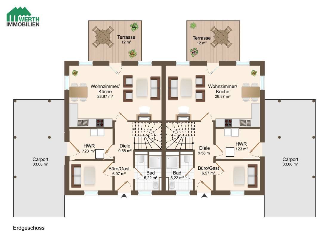 Grundstück: Klein und fein. Das Gesamtgrundstück für beide Haushälften umfasst ca. 737 m² und wird noch geteilt werden. Es erwarten Sie eine pflegeleichte Rasenfläche, zwei Carports mit Kieszufahrten und zwei Terrassen westlich am Haus. Jede Doppelhaushälfte hat Außentüren an drei Seiten.