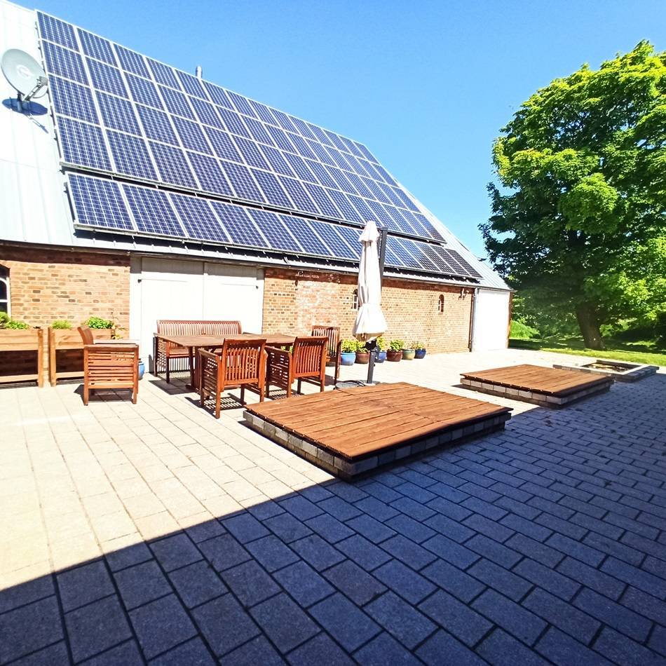 Auf dem Scheunendach sorgt eine 14,5 kWp Photovoltaik-Anlage in Verbindung mit Solar-Unterstützung und einem 1000 Liter Pufferspeicher für Warmwasser für jährliche Einnahmen bis zu 3.300 Euro.