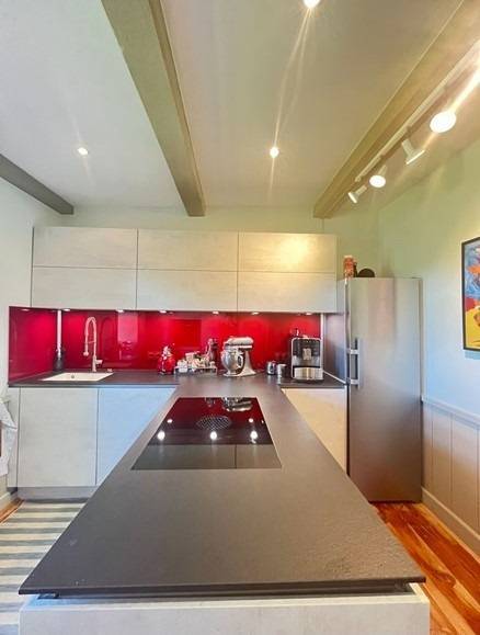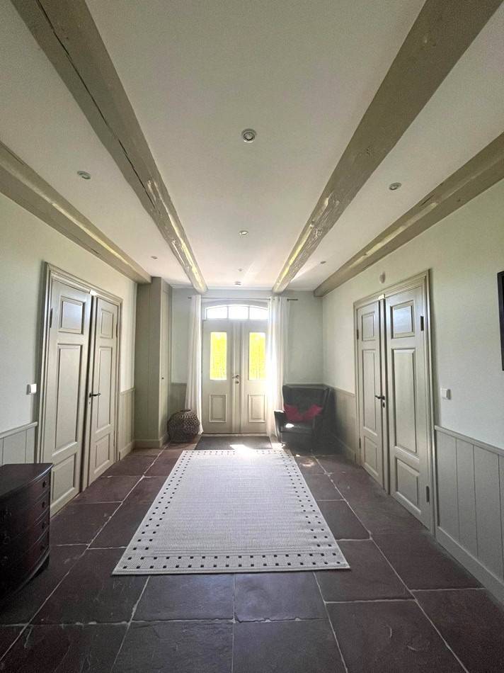 Die Fußböden sind aus Holzdielen in Eiche oder Lärche. Außerdem sind die Dielen mit Steinplatten sowie die gefliesten Bäder mit einer Fußbodenerwärmung versehen. Im Esszimmerbereich ist ein Fußboden aus Ziegelsteinen angelegt. Die Türen und die Fenster sind aus Mahagoni Hartholz.