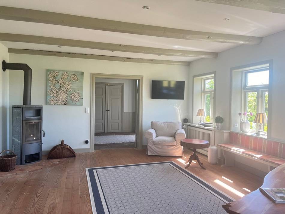 Eingangsdiele, Küche, Esszimmer, Hauswirtschaftsraum mit WC und Waschbecken, Gäste-WC, Diele mit Treppe ins Dachgeschoss, Wohnzimmerbereich mit einem schwenkbaren Kamin, zwei Bibliotheken mit jeweiligem Kaminofen, Schlafzimmer mit eigenem Zugang zum Badewannenbad.