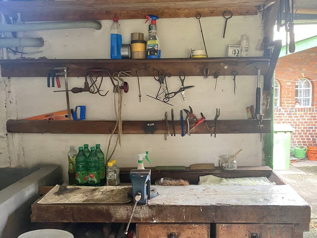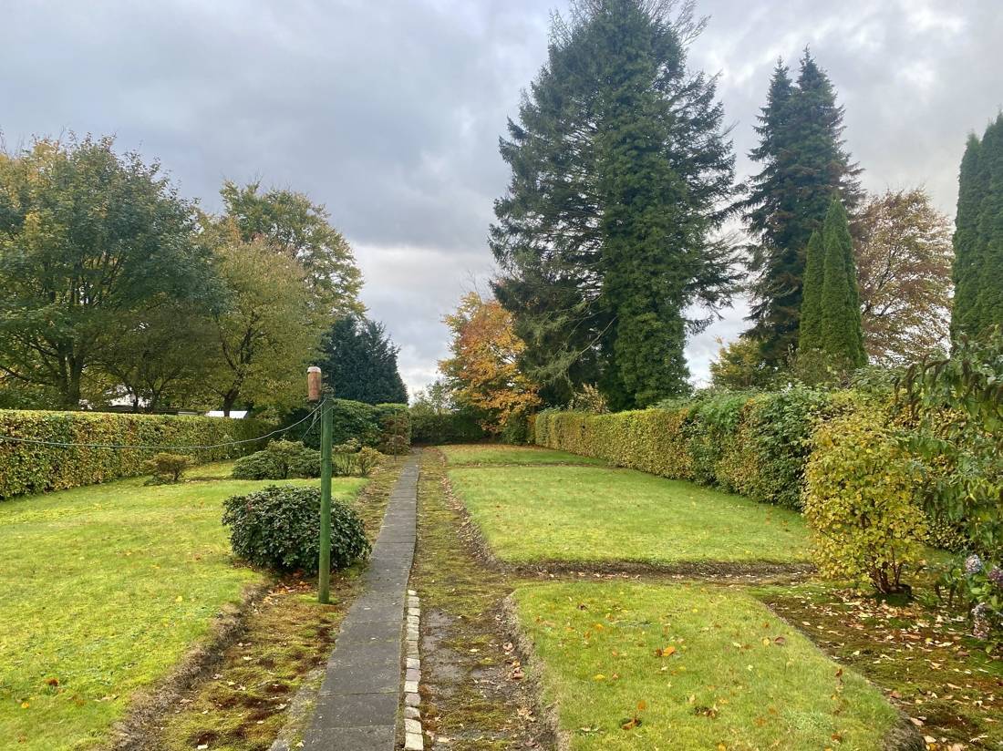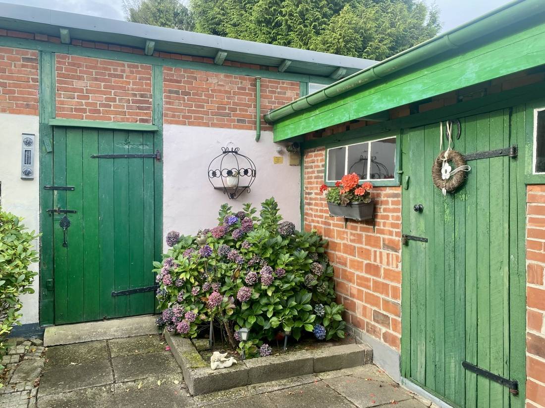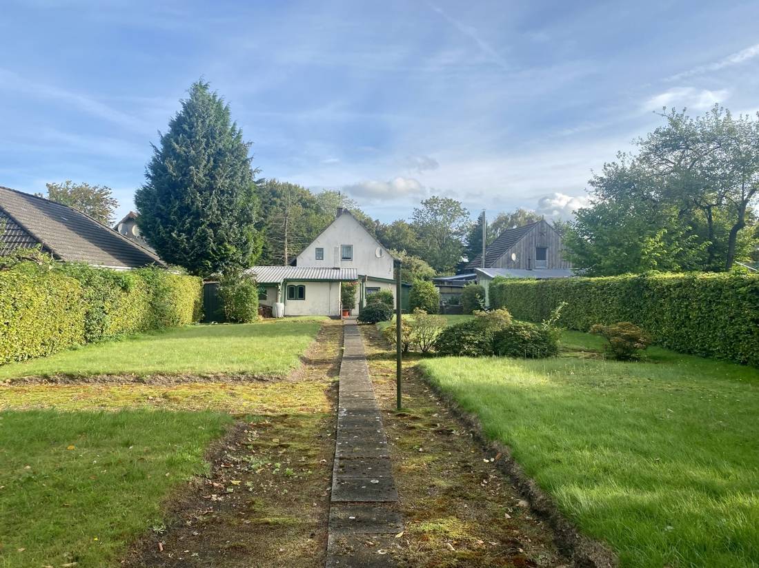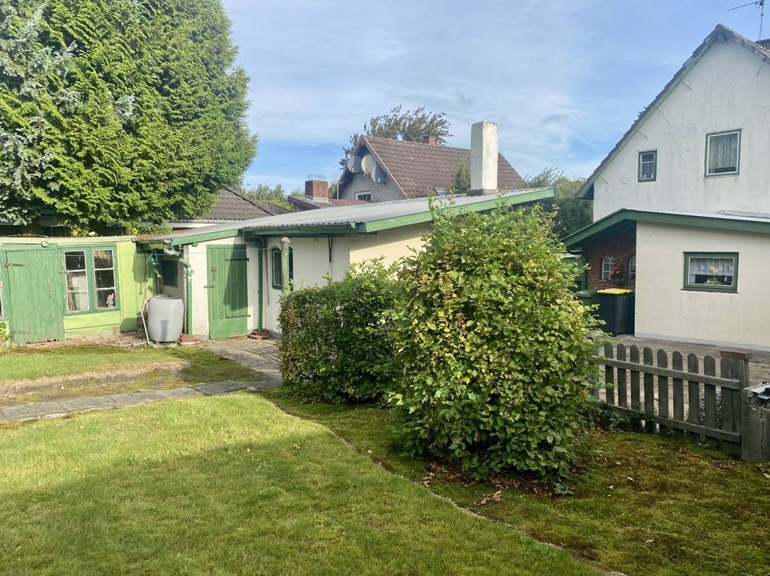 Der großzügige Garten bietet vielfältige Nutzungsmöglichkeiten. Eine Terrasse lädt zum Entspannen im Freien ein, während sich der ehemalige Gemüsegarten bei Bedarf wieder als Anbaufläche gestalten lässt. Hinter dem Grundstück befindet sich unbebautes Land mit einem Teich, welcher zur ruhigen Atmosphäre der Umgebung beiträgt.