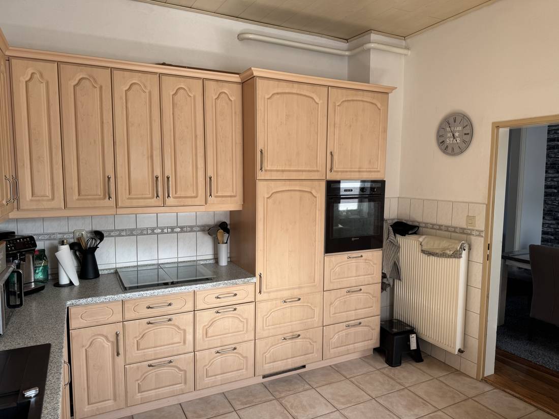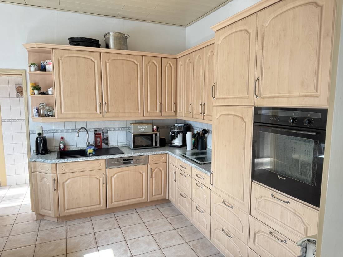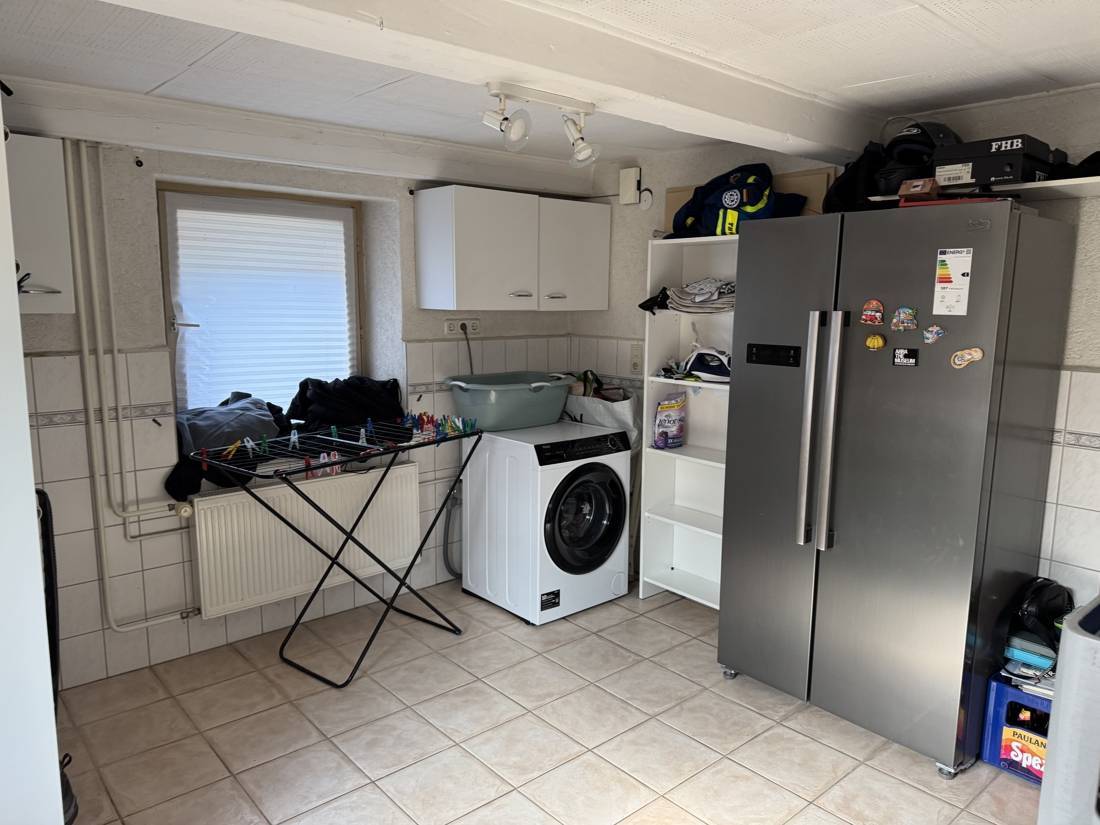 Direkt angrenzend befindet sich die Küche, die funktional gestaltet ist und genügend Platz für Kochbegeisterte bietet. Sie wird durch einen angrenzenden Essbereich ergänzt, der sich perfekt für den Alltag eignet. Ein Hauswirtschaftsraum sorgt für praktischen Stauraum und kurze Wege. Ergänzt wird das Raumangebot im Erdgeschoss durch ein ein Gäste-WC sowie ein separates Bad im Wintergarten, was besonders im Alltag mit Familie oder Besuch sehr angenehm ist.
