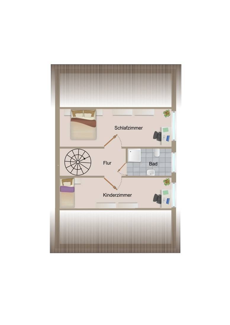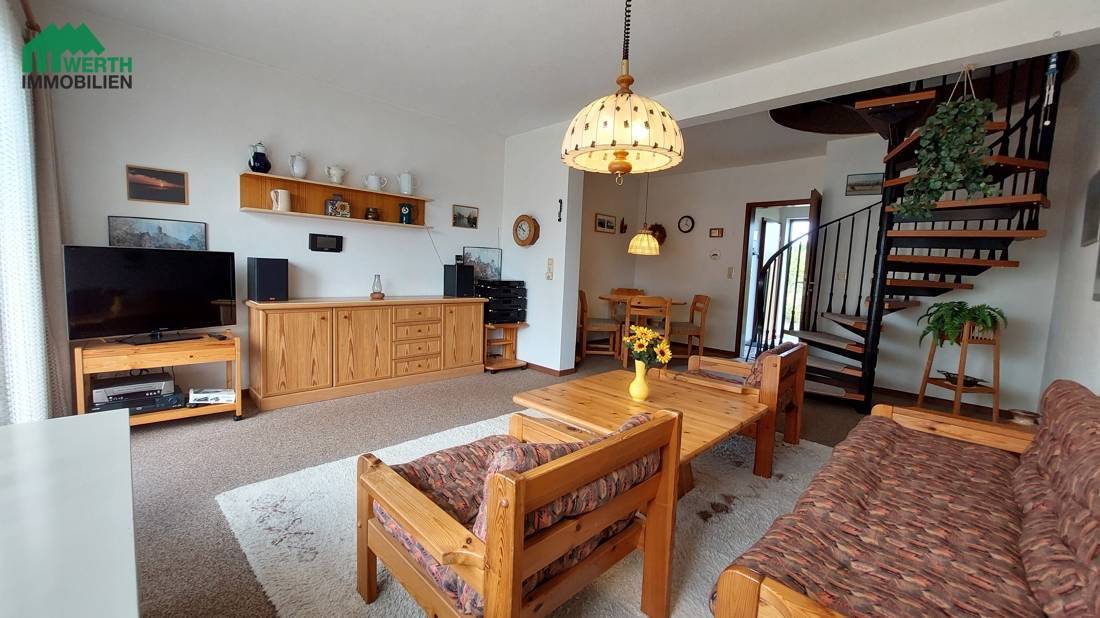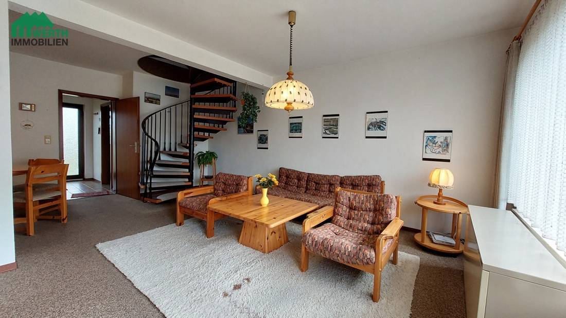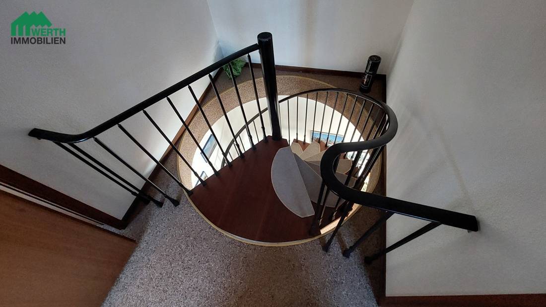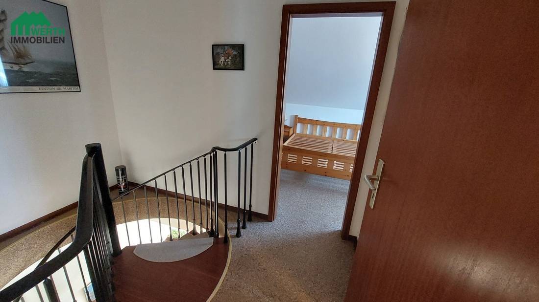 Im Erdgeschoss erwartet Sie ein helles und geräumiges Wohn- und Esszimmer. Über den Flur gelangen Sie außerdem in die separate Küche, ein kleines Gäste-WC sowie den praktischen Hauswirtschaftsraum. Über eine Wendeltreppe erreichen Sie das Dachgeschoss, wo sich ein Badezimmer sowie zwei Schlafzimmer befinden.