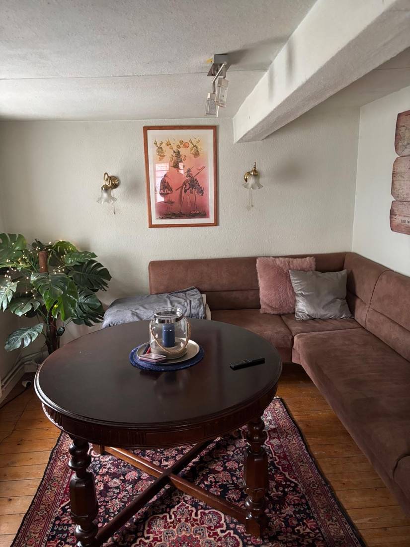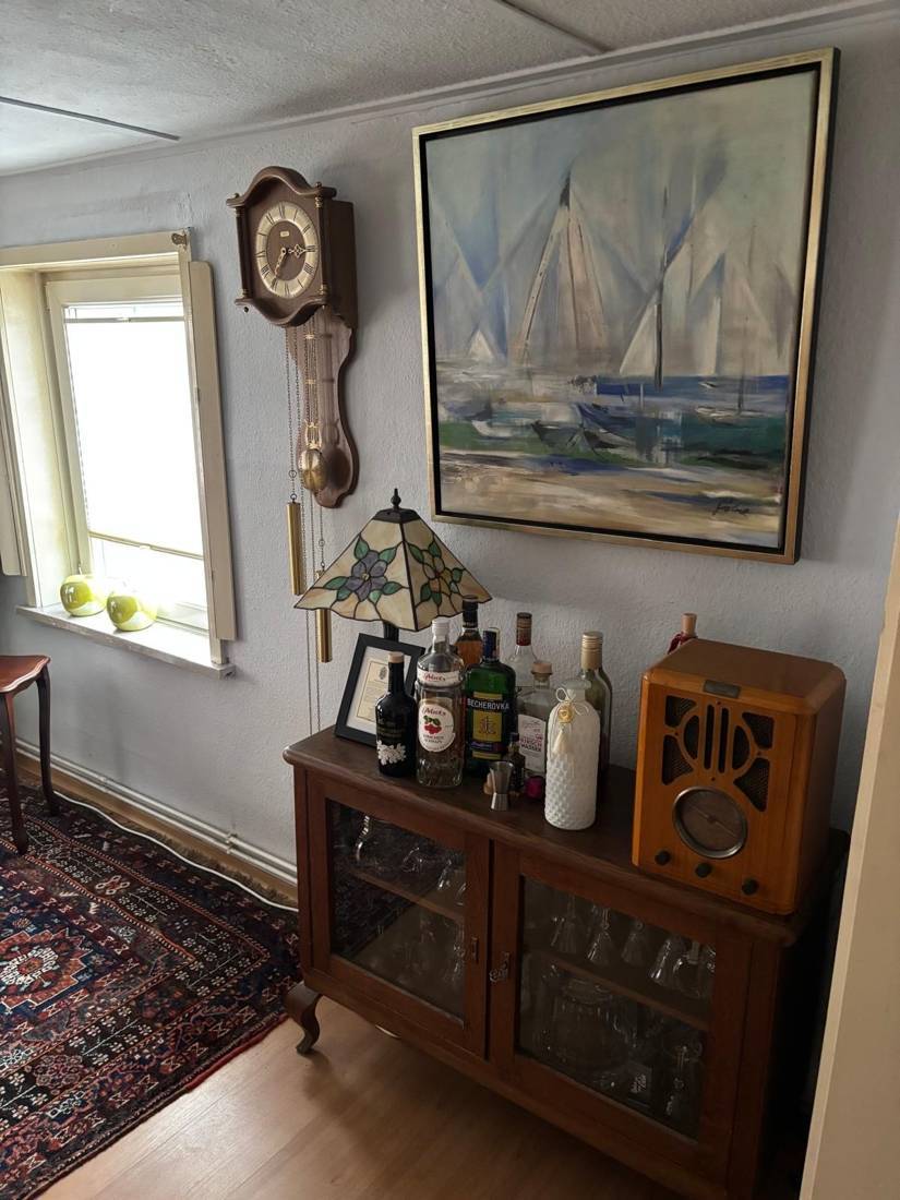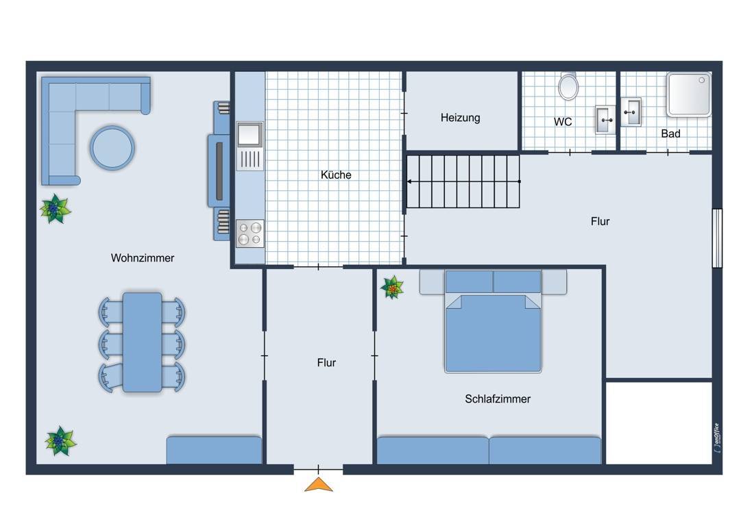 Im Erdgeschoss befinden sich das Wohnzimmer. Vom Flur aus gelangen Sie ins Schlafzimmer und in die Küche.