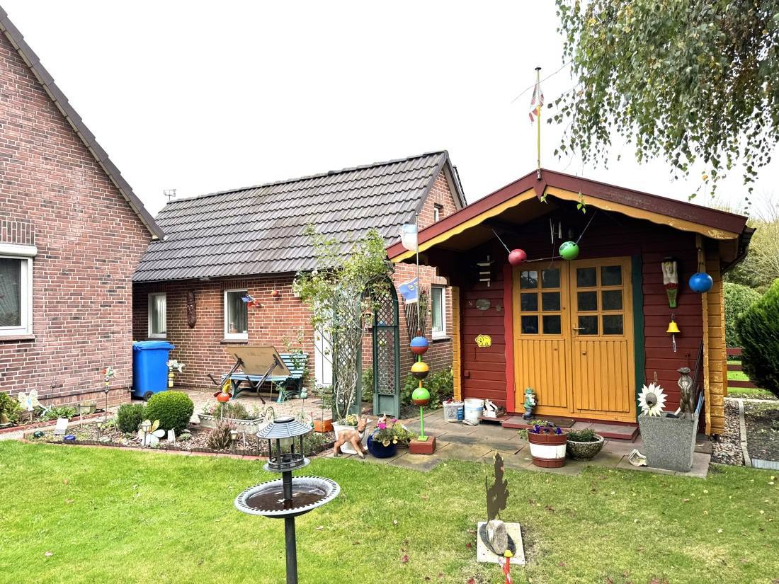 Der Außenbereich verfügt über eine Garage, die Platz für mindestens ein Fahrzeug bereithält. Hinter der Garage befindet sich ein Abstellraum und eine Gartenhütte.