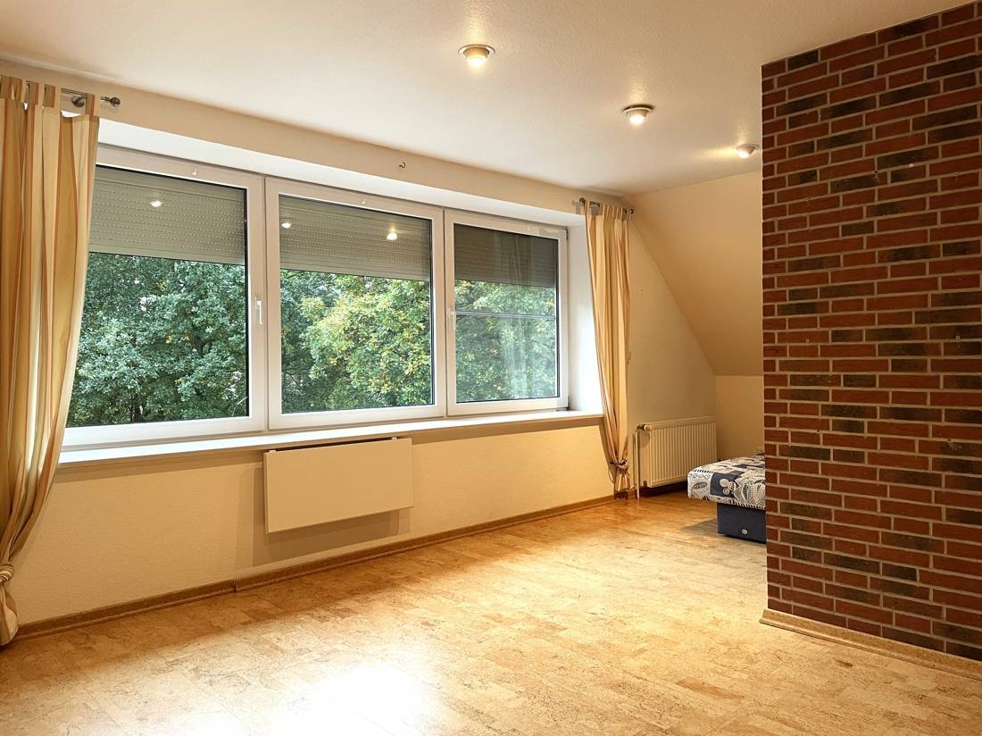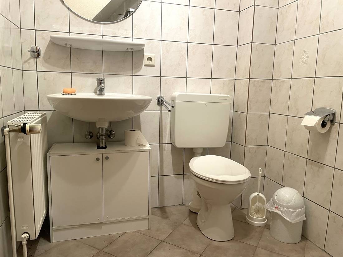 Das geräumige helle Wohnzimmer mit Kachelofen und ein Schlafzimmer mit angrenzendem Badezimmer betritt man ebenfalls von der Diele aus.