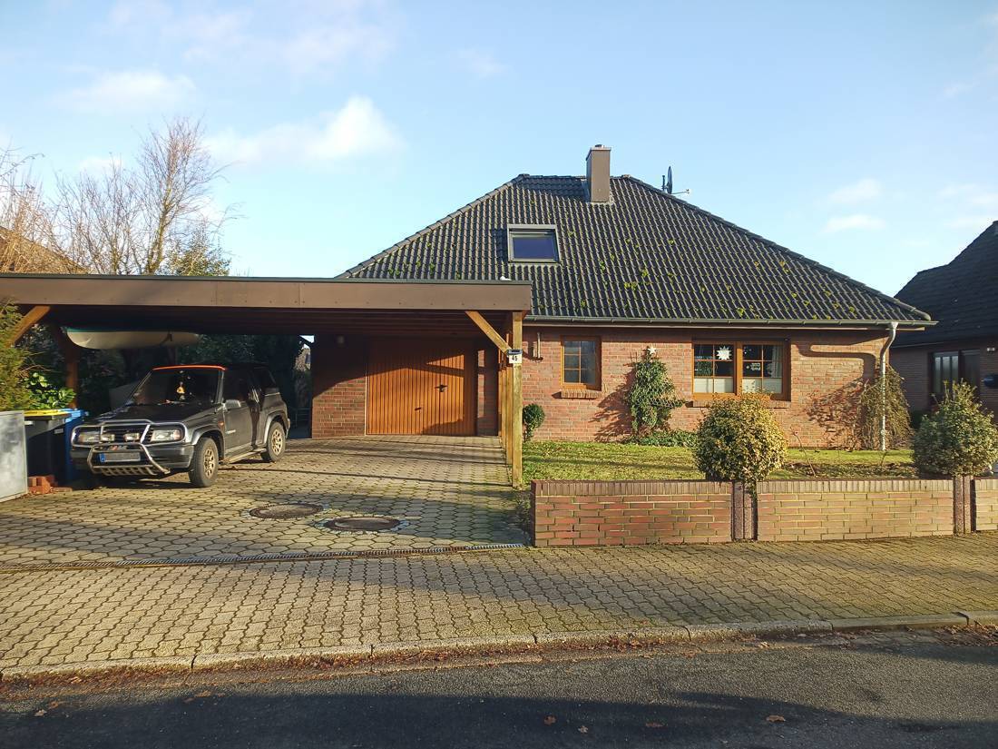 Ein Doppelcarport vor der Garage bietet Platz für zwei Autos. Eine Garage ist im Haus integriert worden.