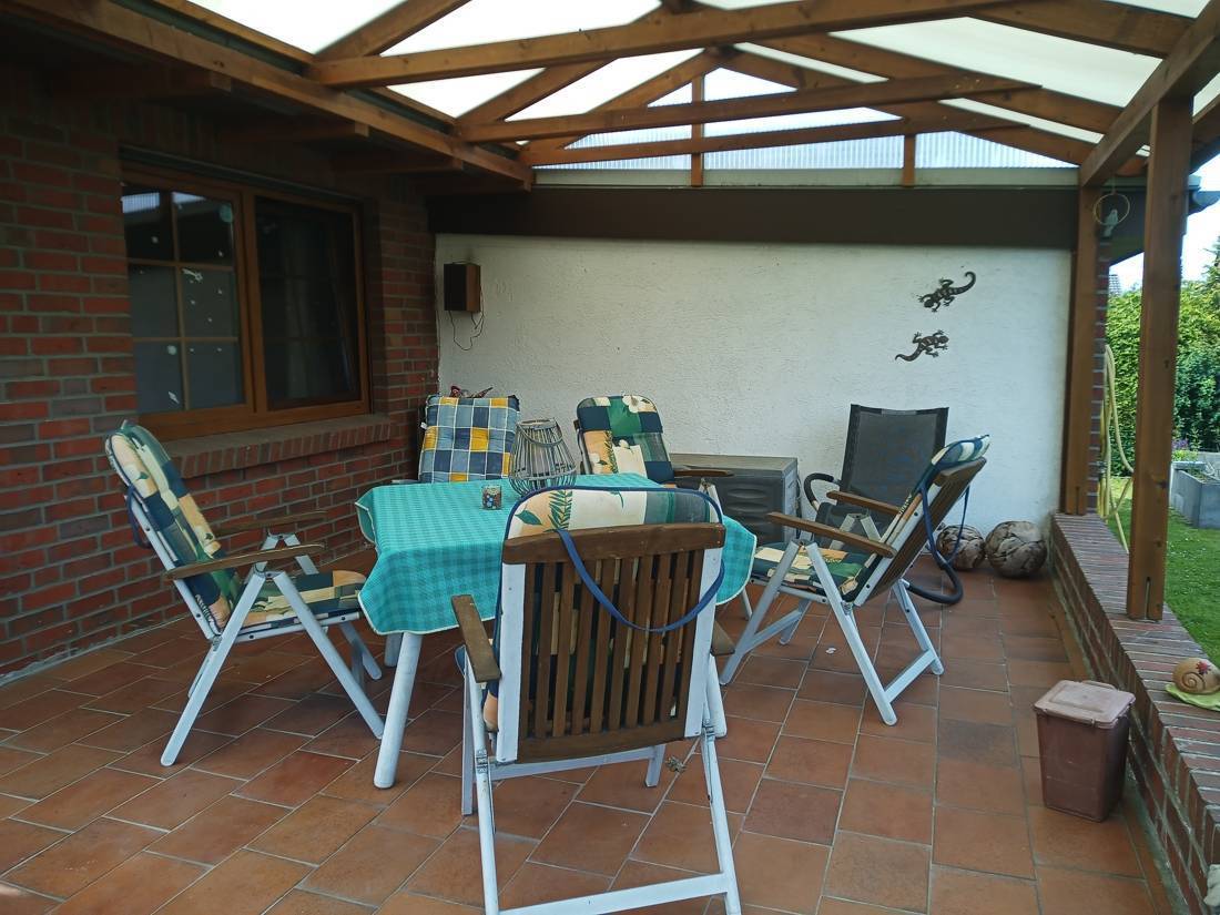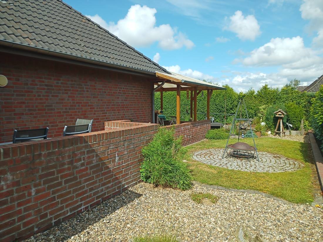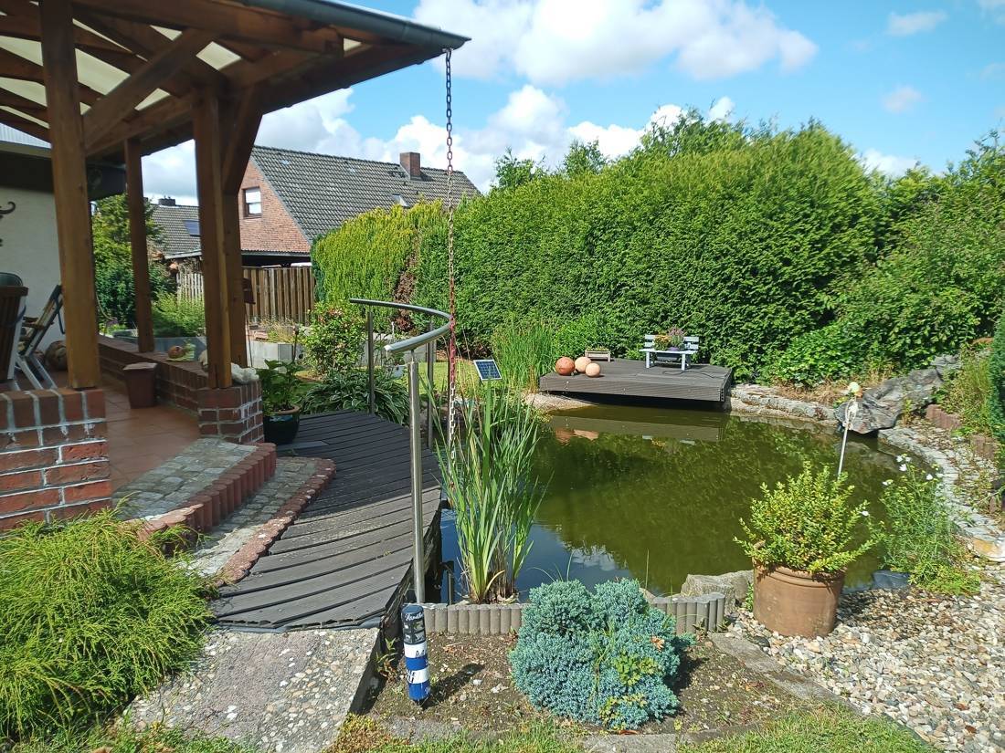 Auch im Außenbereich gibt es viel zu entdecken. So kann man auch an regnerischen Tagen in der erbauten Veranda Platz nehmen und das Leben genießen. Zudem bietet ein Fischteich Möglichkeiten den Alltagsstress zu vergessen. Auch können Sie Ihre gärtnerischen Fähigkeiten unter Beweis stellen.