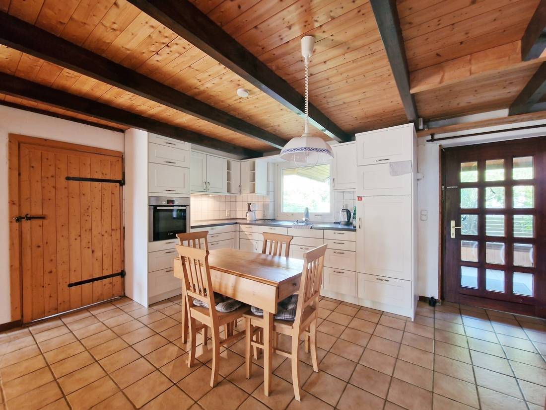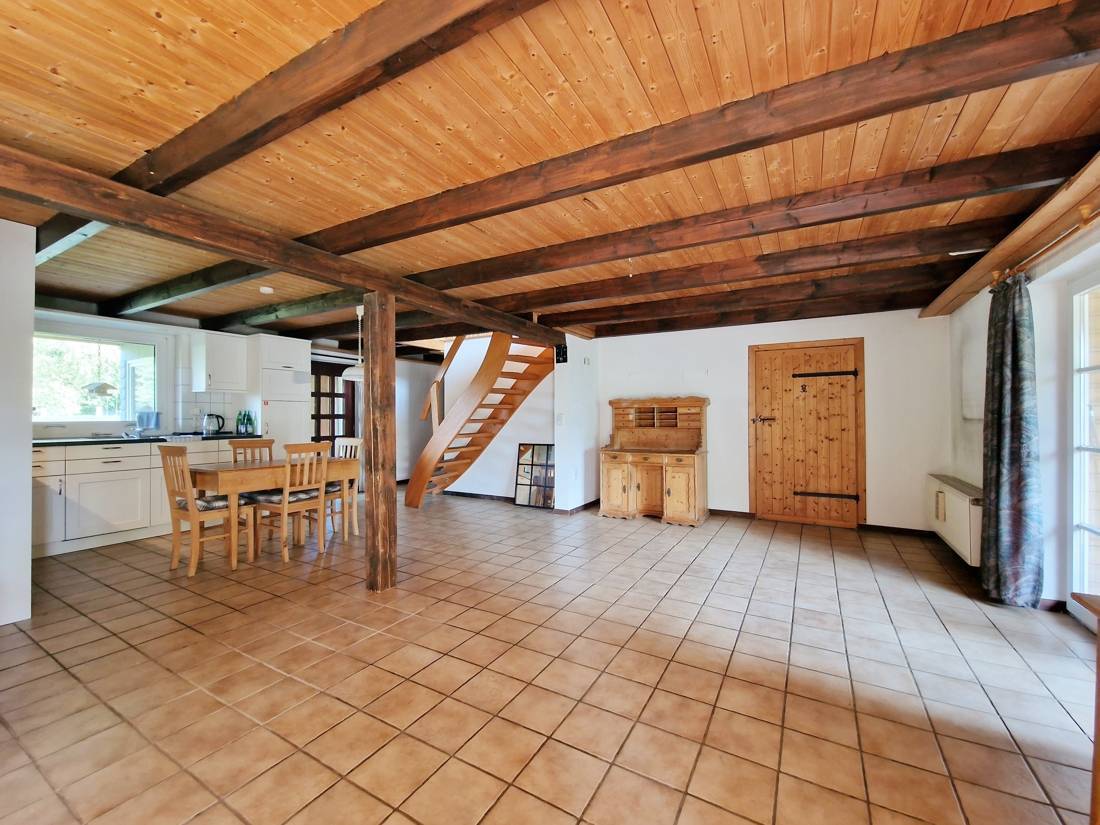 Durch den Windfang betreten Sie den großen, lichtdurchfluteten Wohn- und Essbereich. Die offene Balkenlage unterstreicht das großzügige Raumgefühl, die offene Küche (Bj. 2015) fügt sich zeitlos ein – perfekt für gemeinsames Kochen und gesellige Runden. Von hier geht es auf die große Südterrasse, teilweise überdacht, die nahtlos in den geräumigen Wintergarten überleitet: Ihr Lieblingsplatz zu jeder Jahreszeit. Ein Zimmer mit Zugang zum Wintergarten und Kaminofen schafft behagliche Rückzugsorte. Ergänzt wird das Erdgeschoss durch ein Schlafzimmer, ein Duschbad sowie einen Abstellraum.