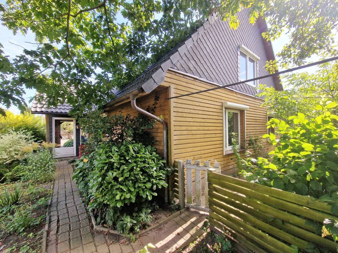 Ursprünglich als Gewerbehalle errichtet, wurde die Immobilie 1994 komplett umgebaut und aufgestockt und in Wohnraum umgenutzt. Die Fassade zeigt den norddeutschen Charakter mit rotem Verblender, später aber mit Holz verschalt – ein stimmiges, warmes Erscheinungsbild. Ein Flachdachanbau beherbergt die Einliegerwohnung.