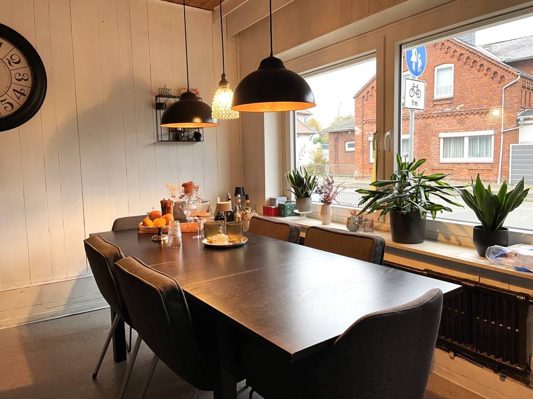 Im unteren Bereich befindet sich im Vorderhaus ein Esszimmer, eine Küche, ein Wohnzimmer und im Übergang (ehemalige Schuppen) ein Badezimmer, Abstellmöglichkeiten und ein WC.