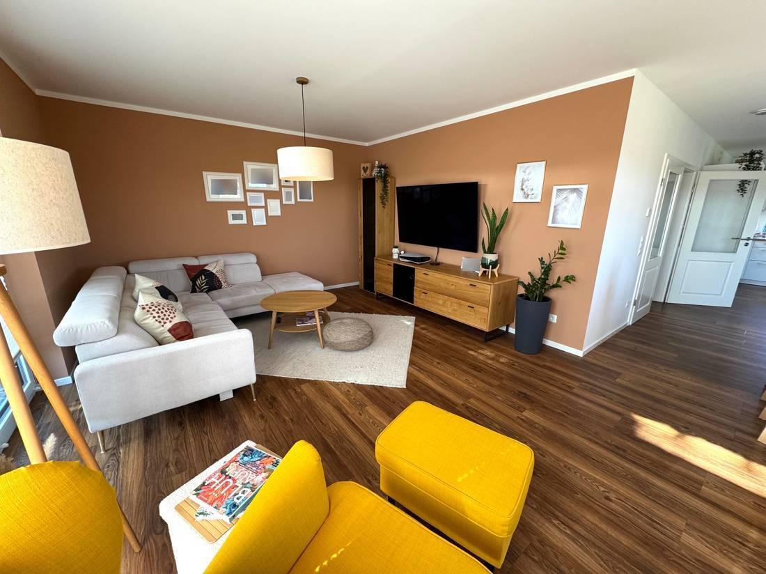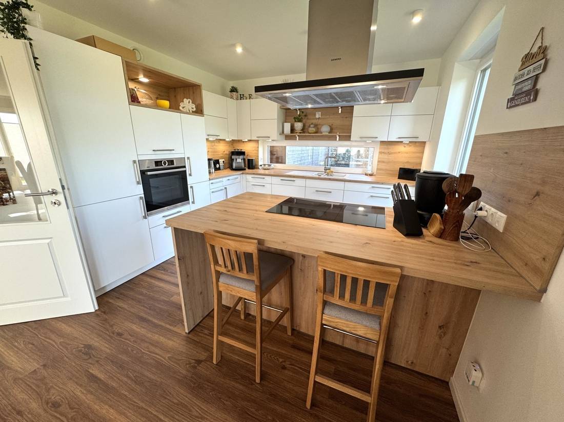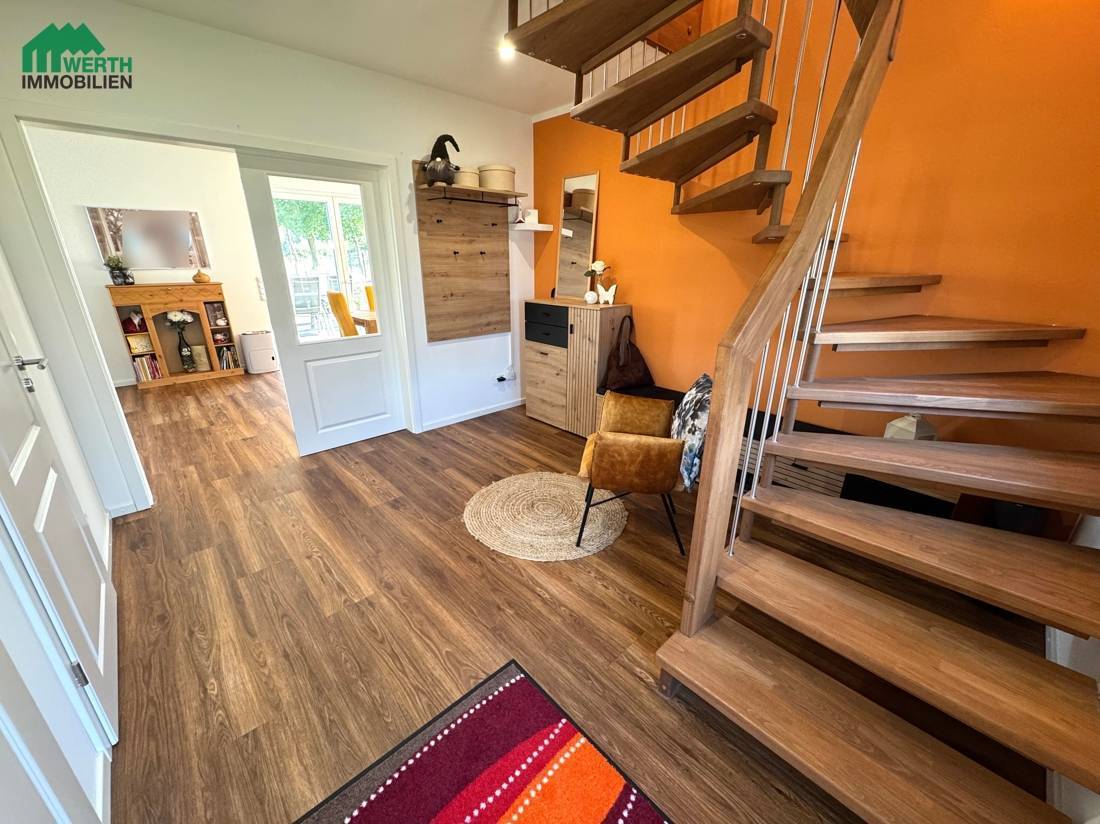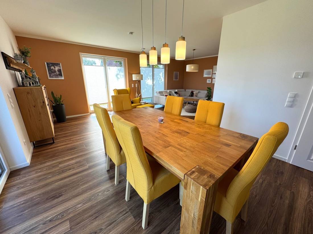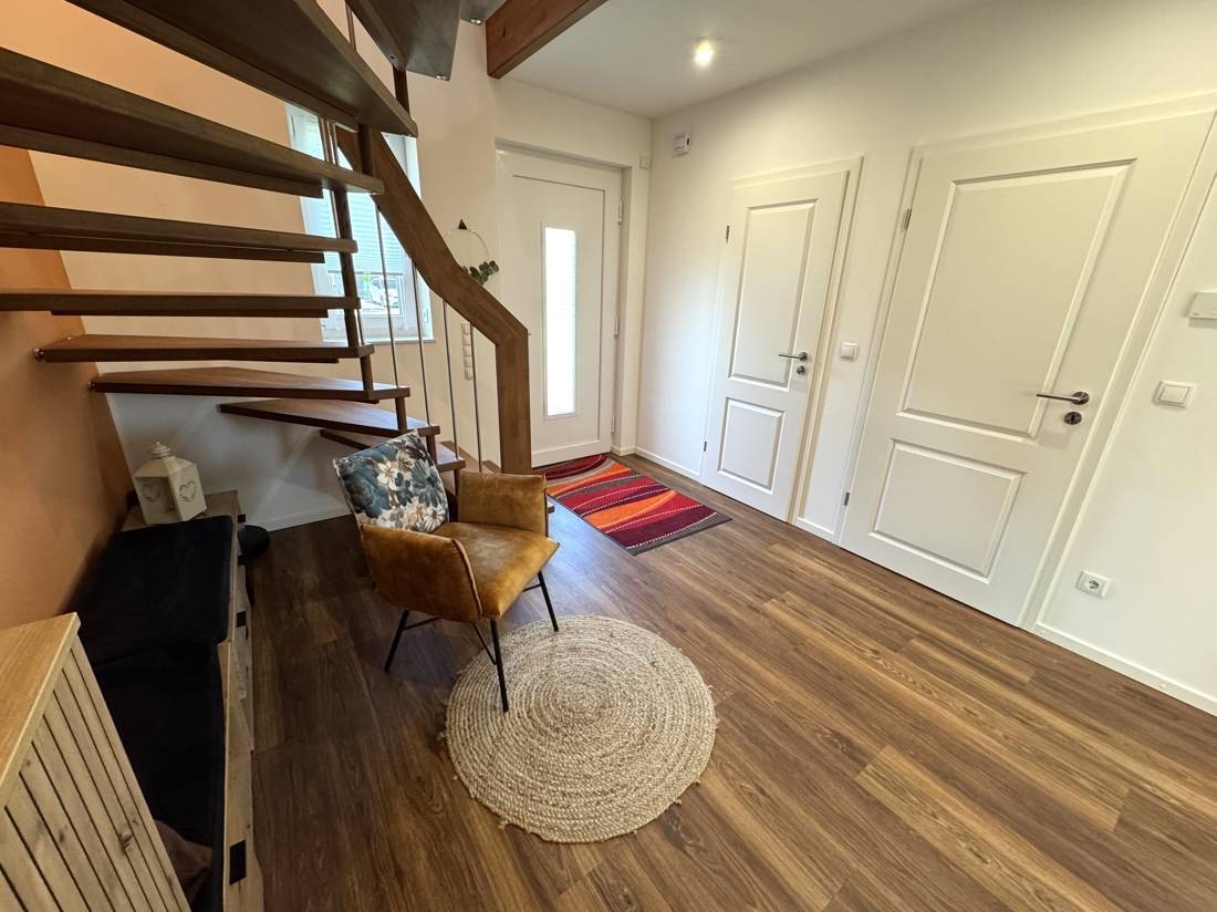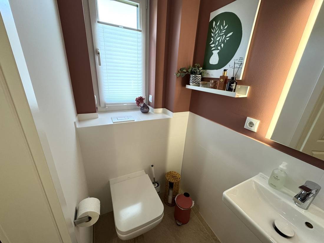 Im Erdgeschoss gelangen Sie vom Flur aus in das Gäste-WC, den Hauswirtschaftsraum sowie in den offenen Wohn- und Essbereich mit integrierter Küche. Hier bildet das Herzstück des Hauses eine moderne, helle Wohnlandschaft mit direktem Zugang zur großen Terrasse und zum Garten. Die hochwertigen Bodenbeläge und großen Fensterfronten unterstreichen die freundliche Atmosphäre.