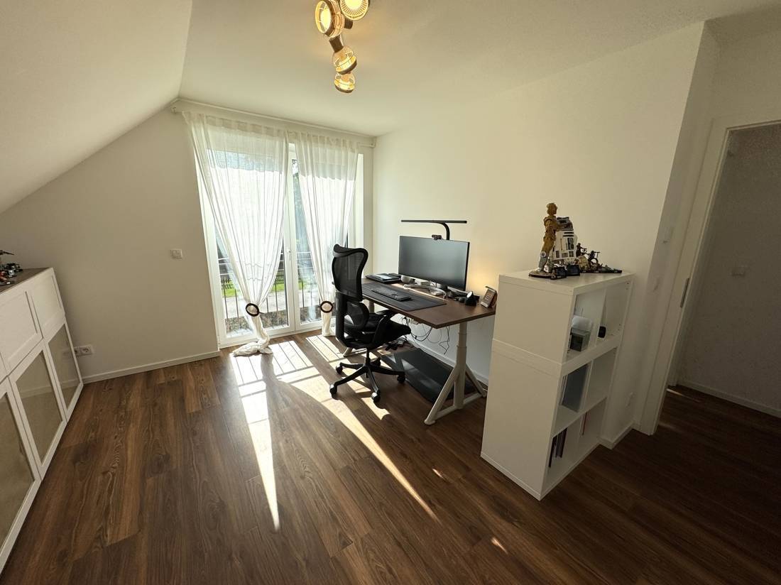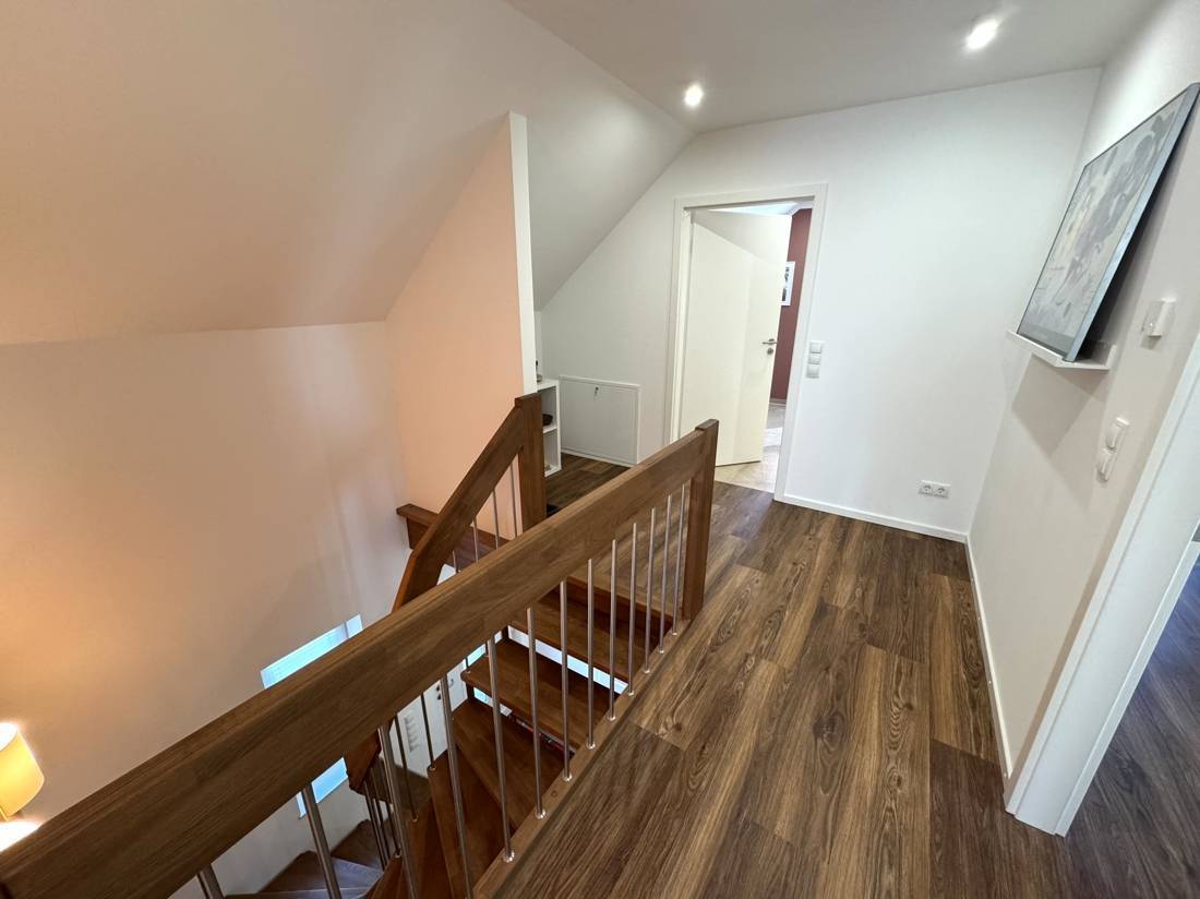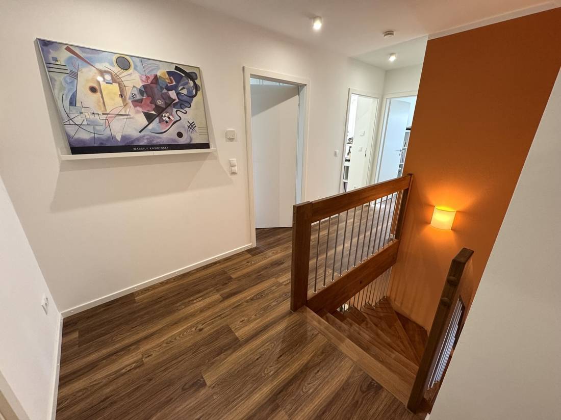 Über eine elegante Buchentreppe erreichen Sie das Dachgeschoss. Von der Empore aus erschließen sich das stilvolle Badezimmer mit Wanne und begehbarer Dusche, zwei Kinderzimmer sowie die Ankleide, die direkt ins Elternschlafzimmer führt. Kurze Wege, viel Stauraum und eine klare Trennung zwischen Wohnen und Rückzugsbereichen sorgen für ein besonders angenehmes Wohngefühl. Abgerundet wird das Raumangebot durch einen voll beplankten Spitzboden, der sich hervorragend als Lagerfläche eignet.