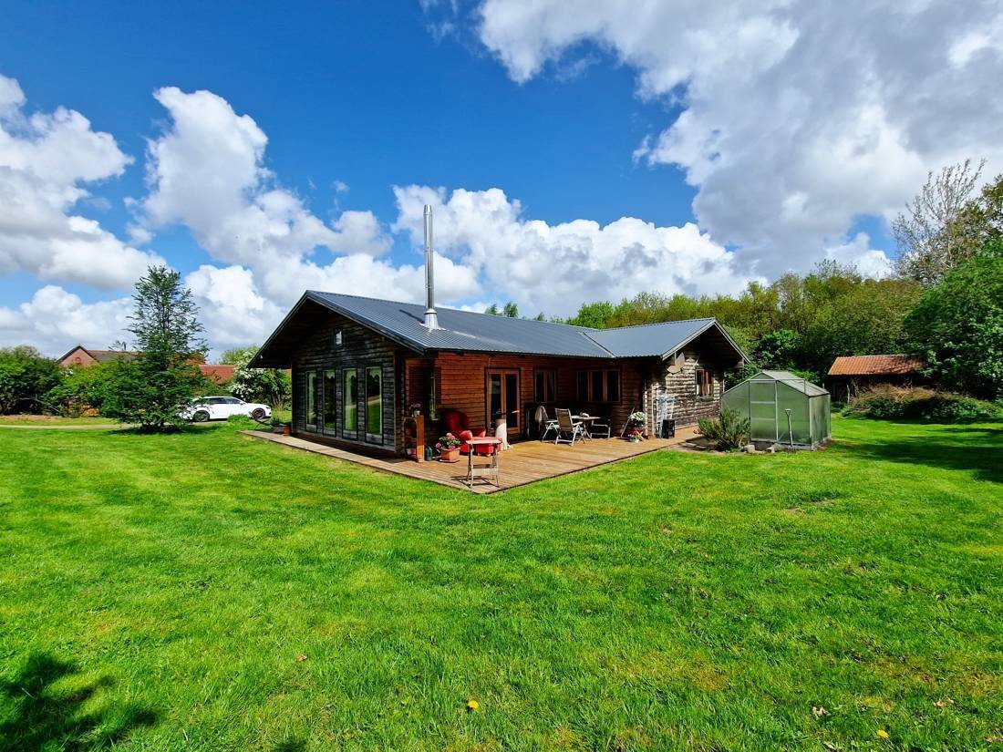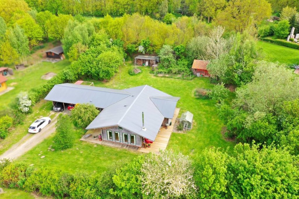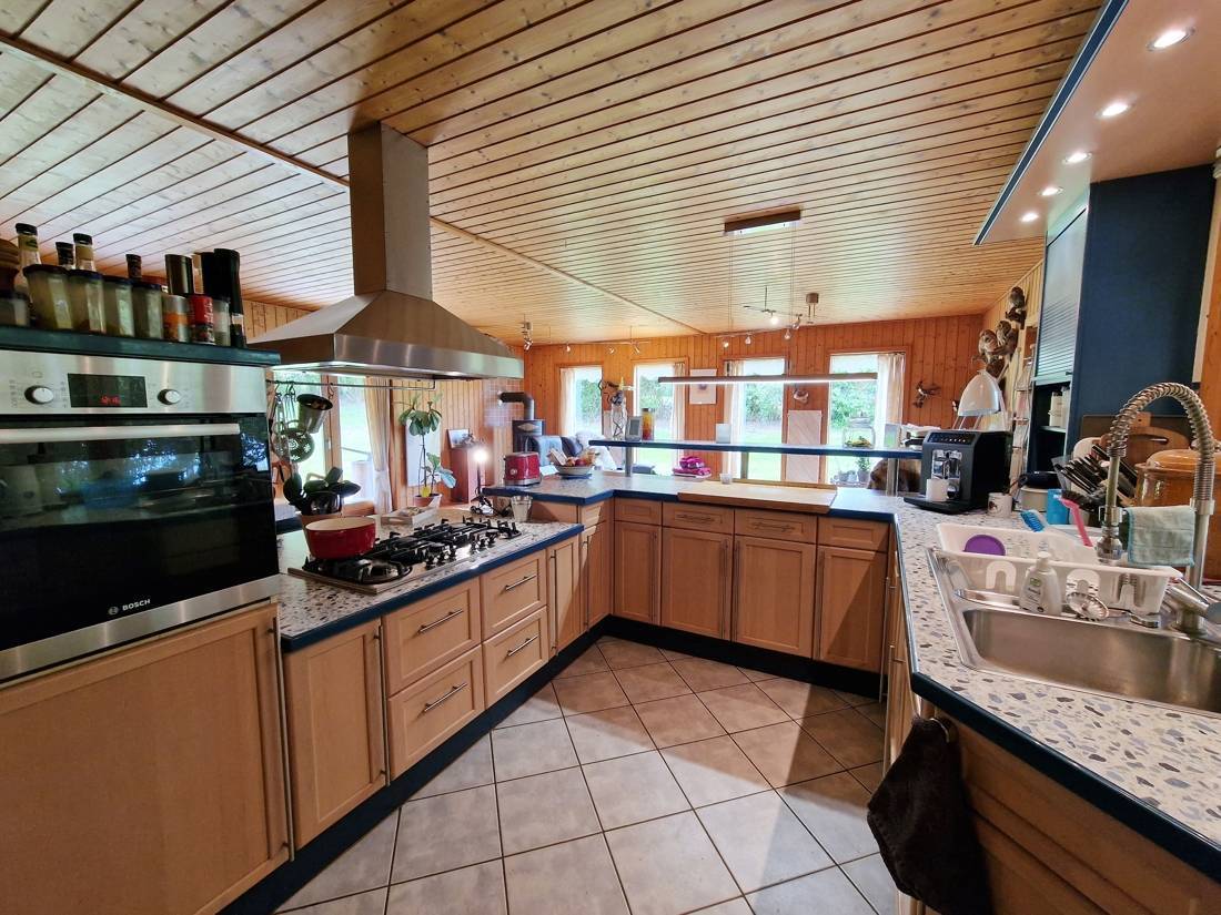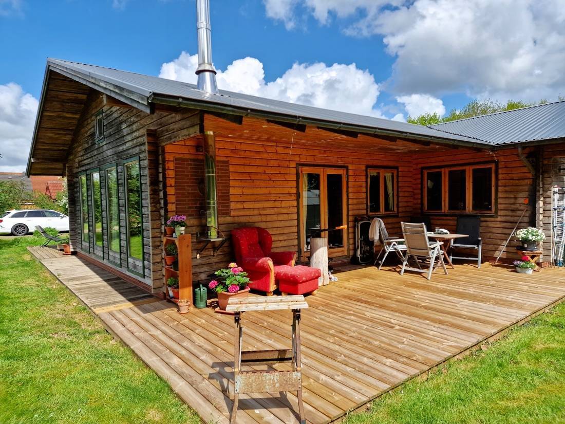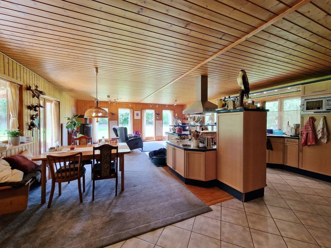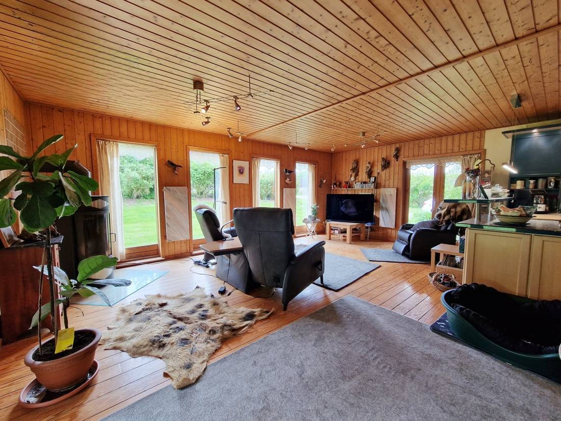 Zum Verkauf steht ein geräumiger Bungalow aus Holz auf einem ca. 3.200 m² großen Grundstück in einer ruhigen Lage. Die Immobilie wurde im Jahre 1996 gebaut und verfügt über eine Wohn- und Nutzfläche von ca. 150 m². Das Holzhaus bietet den Bewohnern einen hellen Wohn- und Essbereich mit einer offenen, hochwertigen Küche mit Massivholz-Fronten. Gekocht wird, wie bei den Profis, auf einem Kochfeld mit Gas. Durch die terrassentiefen Fenster gelangt viel Licht in den Wohnbereich. Den Eigentümern stehen drei Schlafzimmer, ein Arbeitszimmer, ein Vollbad mit Eckbadewanne, ein Gästebad, ein Ankleidezimmer, ein Hauswirtschaftsraum mit Zugang nach Außen und ein separater Abstellraum zur Verfügung. Durch die gute Raumaufteilung ist die Immobilie ideal für eine Familie geeignet.
