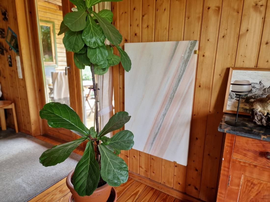 Im Haus wurden überwiegend massive Rotkieferdielen verbaut, die Bäder verfügen über Bodenfliesen und sind deckenhoch gefliest. Geheizt wird elektrisch über Strahlungskörper aus Marmor. Ein Kaminofen (Genehmigung läuft 2023 aus) mit Edelstahlrohr sorgt in der kalten Jahreszeit für eine warme Atmosphäre. Die elektrische Heizung hat kaum Staubaufwirbelungen und ist somit gut für Allergiker geeignet.