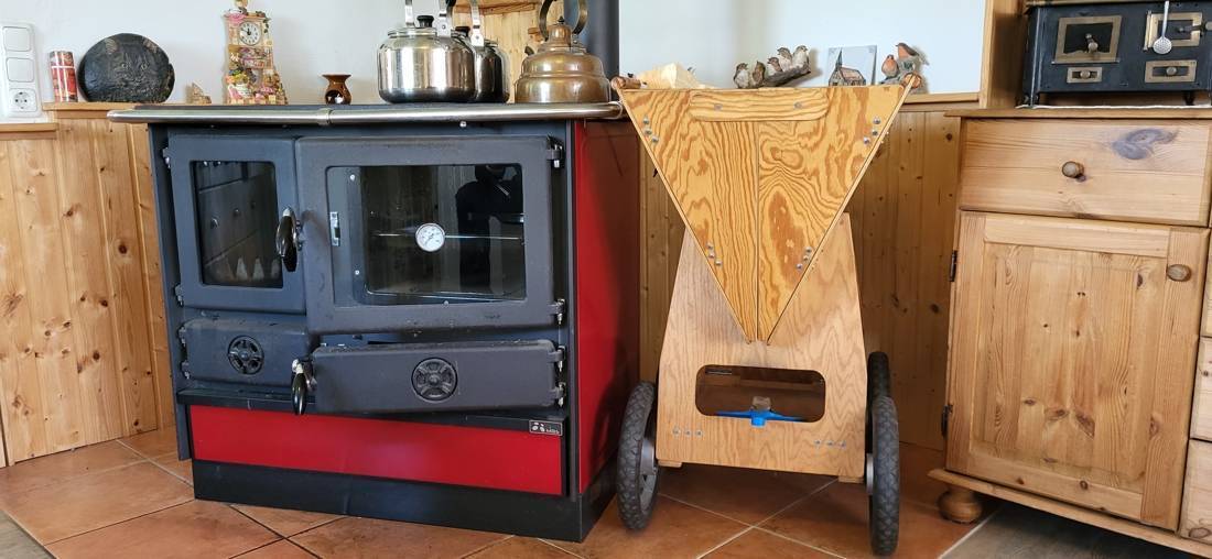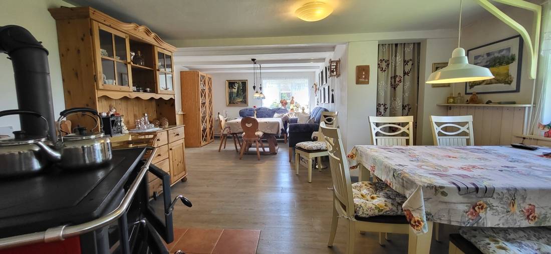 Auch vom gemütlichen Wohn- und Essbereich können Sie diesen Ausblick genießen. Lauschig warm wird dieser Bereich durch die sogenannte Küchenhexe – ein Ofen der nicht nur heizt, sondern ebenfalls zum kochen genutzt wird.