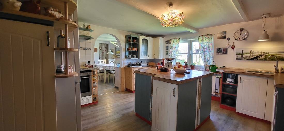 Durch die Haustür gelangen Sie in den Dielenbereich mit Zugang zum Schlafzimmer und zur Küche. Dort empfängt Sie eine helle Landhausküche mit herrlichem Blick in den Garten und in die Natur.
