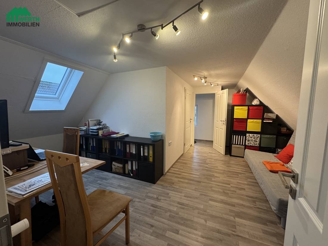 Das Dachgeschoss bietet einen weiteren großzügigen Wohnbereich, ein zusätzliches Schlafzimmer und ein zweites Badezimmer, was das Haus ideal für Familien oder Gäste macht.