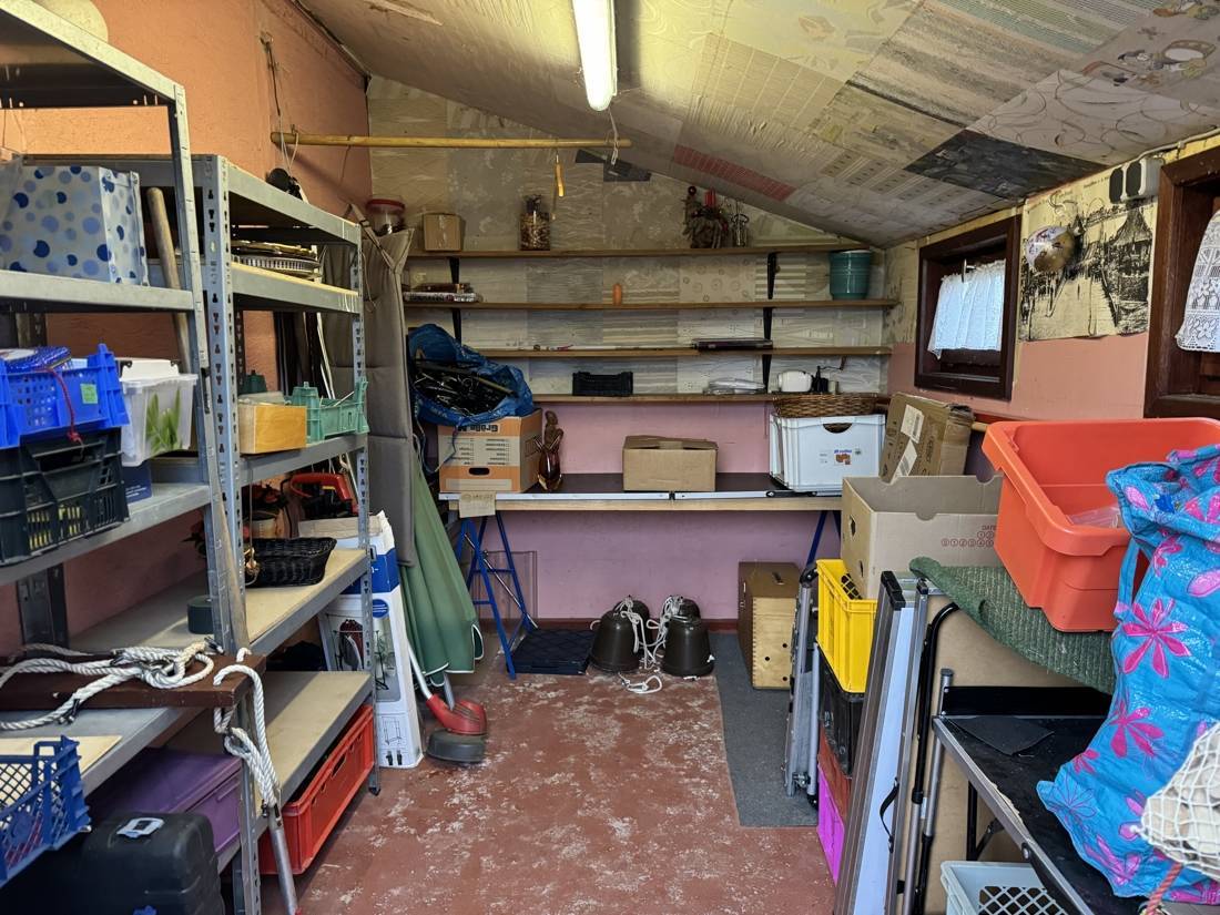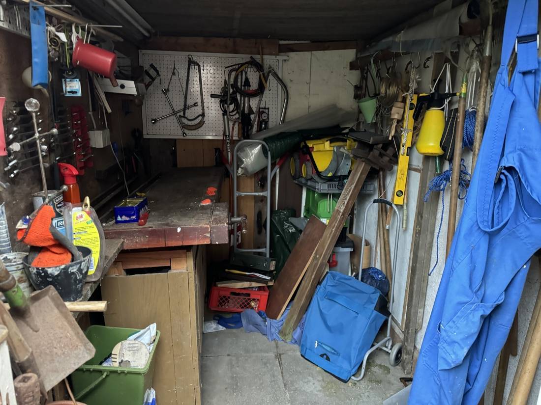 Eine Garage bietet Platz für Ihr Fahrzeug und ist damit vor äußeren Witterungsbedingungen geschützt. Zudem gibt es für alle Bastler einen kleinen Werkstattraum hinter der Garage sowie einen Abstellraum am Haus für kleine und große Projekte.