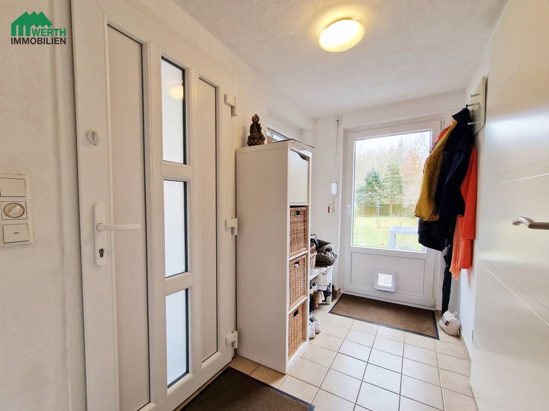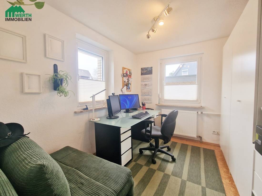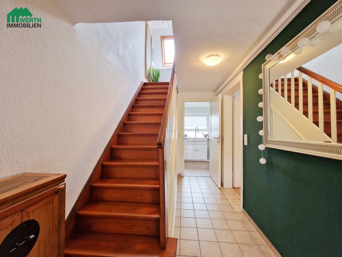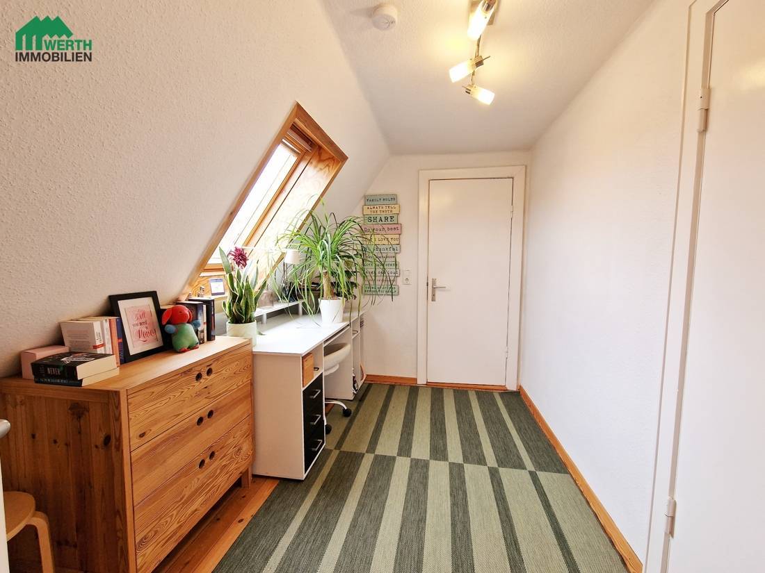 Der Eingangsbereich führt über eine kleine windgeschützte Veranda in den Flachdachanbau, der neben dem Eingangsbereich auch das moderne Duschbad mit Fußbodenheizung beherbergt – klein aber fein. Im Erdgeschoss befinden sich ein großzügiges Wohn- und Esszimmer, eine helle Küche mit Essecke sowie ein Arbeitszimmer – perfekt für Familien, Homeoffice oder Gäste. Das Dachgeschoss bietet einen kleinen Flur, der als Arbeitsbereich genutzt werden kann, sowie zwei Schlafzimmer.