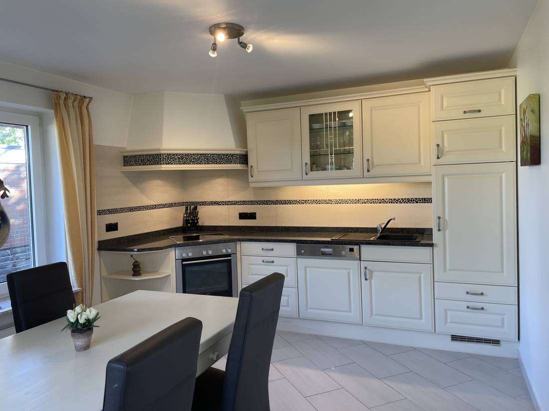 Rechtsseitig vom Wohnbereich wurde eine große moderne Küche mit Essecke eingerichtet.
