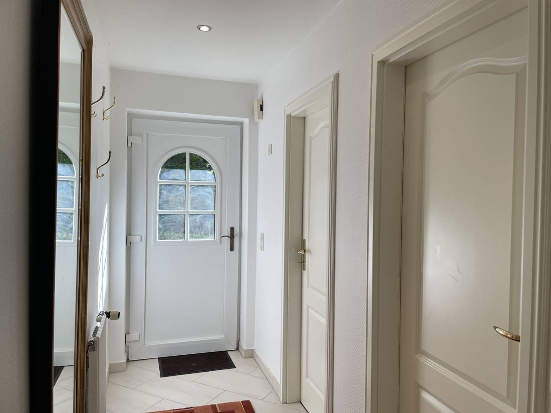 An der linken Seite des Bungalows befindet sich die Eingangstür, von hier gelangt man in einen hellen Flur von dem der Hauswirtschaftsraum mit Waschmaschine, Heizung und Elektroinstallation, ein Bad mit Dusche und WC, ein Schlaf – oder Arbeitszimmer und am Ende des Flures das Wohnzimmer abgeht.