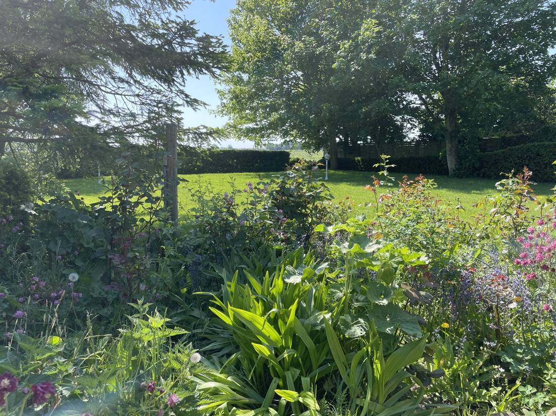 Der Garten ist Pflegeleicht mit einer großen Rasenfläche und ein paar Bäumen zur Schattenspendung angelegt.