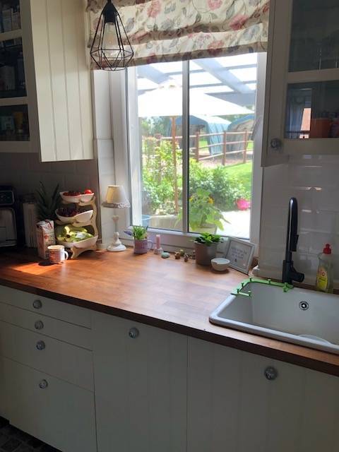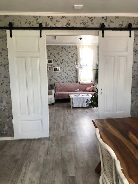 Im Erdgeschoss des Wohngebäudes befindet sich ein Flur mit Diele, ein gemütliches Wohnzimmer mit Kamin, sowie ein angrenzendes Esszimmer. Die Küche ist mit einer Einbauküche von 2018 ausgestattet. Zudem befinden sich auf dieser Etage ein Badezimmer und ein praktischer Hauswirtschaftsraum.