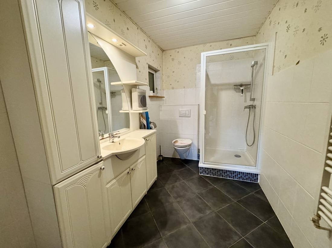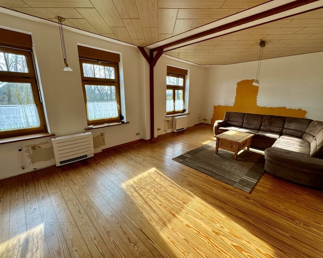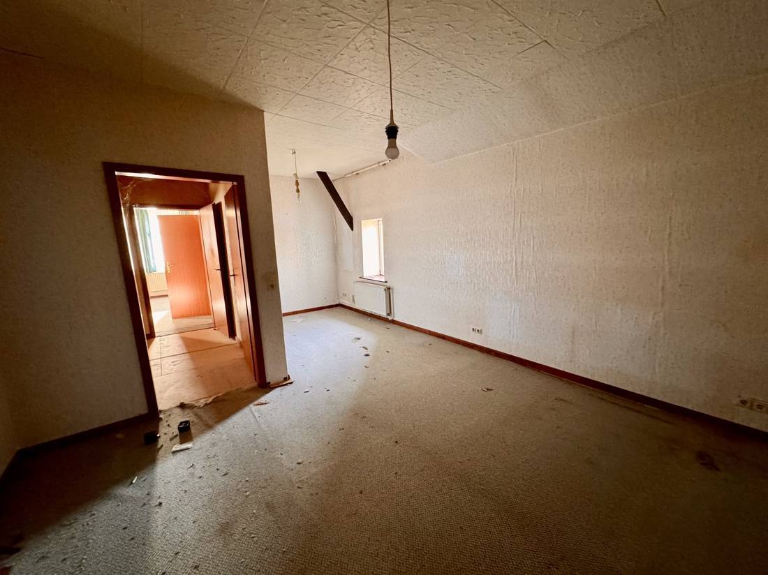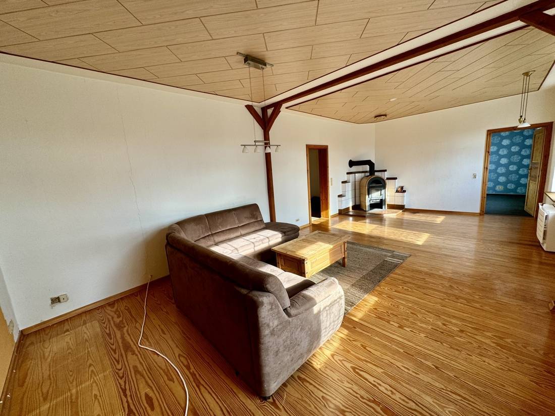 Im Obergeschoss befindet sich eine Einliegerwohnung, die eine Wohnfläche von ca. 95,70m² aufweist. Hier gelangt man über den Flur in die große Küche und das Badezimmer. Ebenfalls befindet sich im Obergeschoss ein großzügiges Wohnzimmer und ein Schlafzimmer. Ein Büro vervollständigt die Einliegerwohnung. Alle notwendigen Installationen liegen vor, jedoch stehen Renovierungsarbeiten im Obergeschoss noch aus.