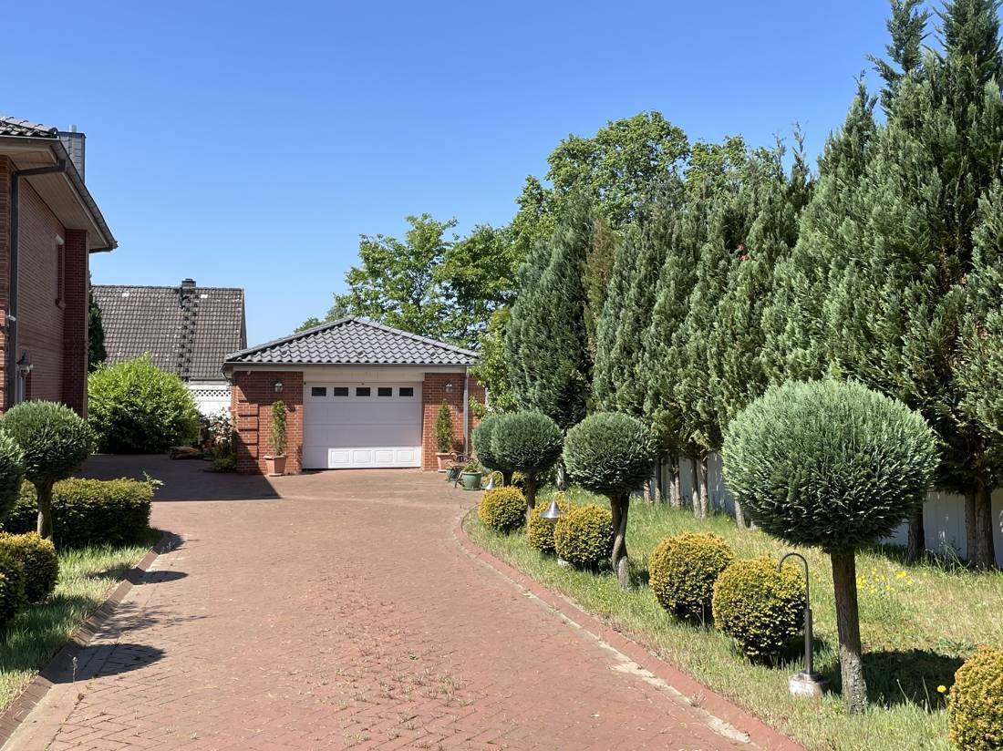 Von hier aus gelangt man in den hinteren Garten oder direkt zur großen Garage (46,86 m²) mit angrenzendem Werkraum.