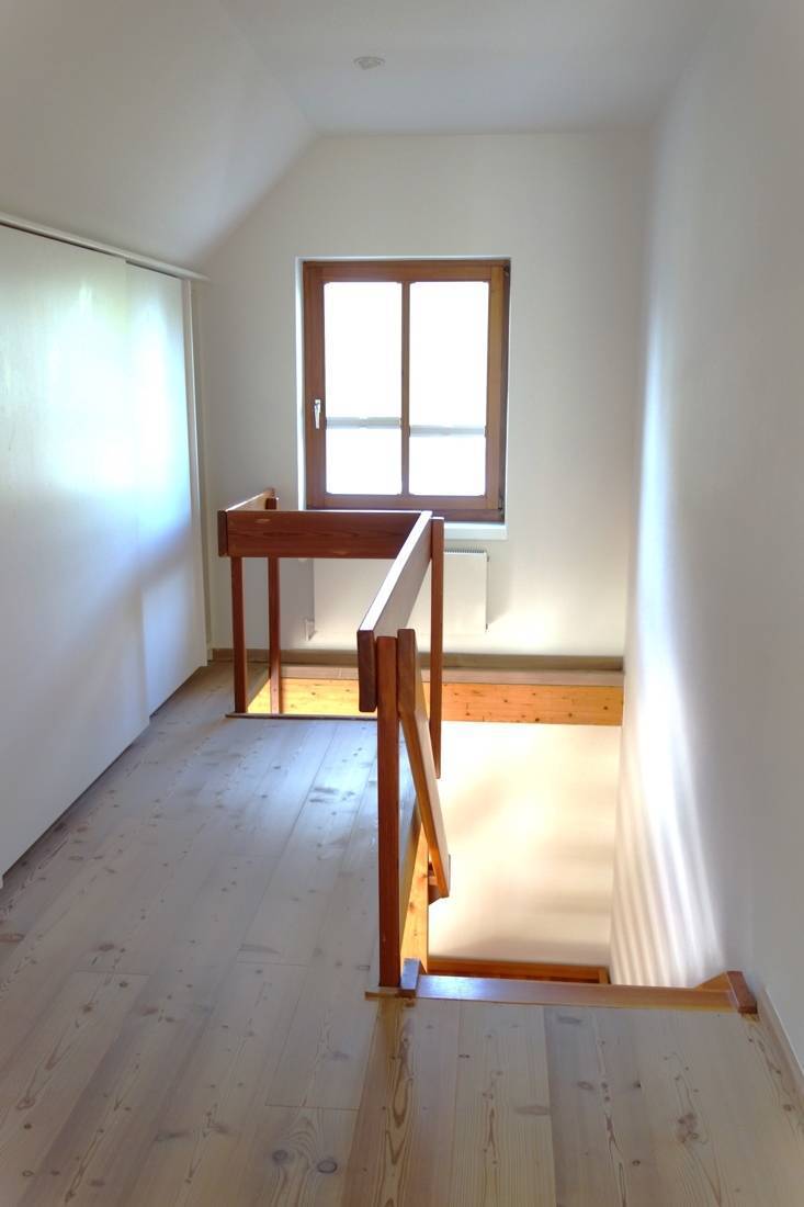 Im Obergeschoss finden Sie zwei weitere helle Zimmer, die mit ihrem Charme zum Entspannen einladen, sowie ein modernes Duschbad. Ein zusätzlicher Balkon bietet Blick ins Grüne und lädt zum Verweilen ein.