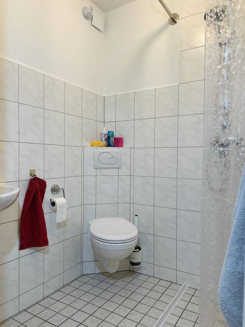 Das zeitlose, helle Duschbad besticht durch helle Fliesen und eine elegante Ausstattung. Hier trifft Design auf Funktionalität ein Raum, der durch sein stilvolles Ambiente überzeugt und sich auch hervorragend als Kunden-WC eignet.