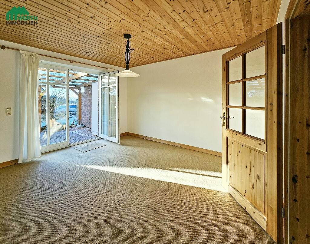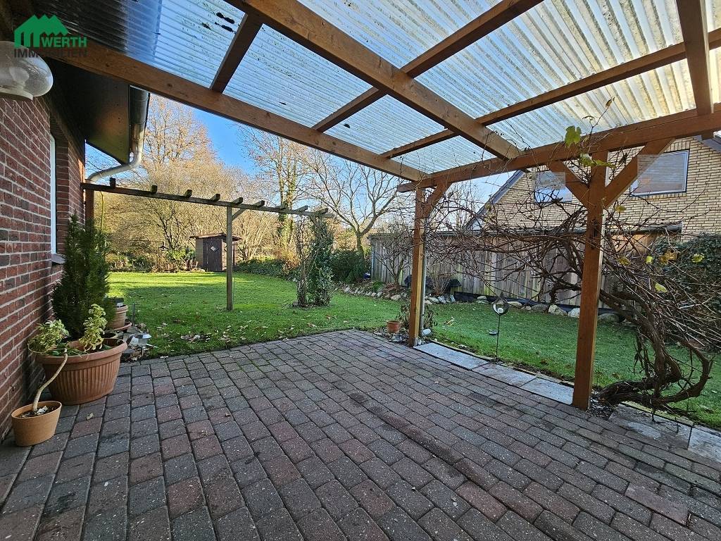 Vor dem Wohnzimmer befindet sich eine überdachte (lichtdurchlässiges Dach) Terrasse. Die Terrasse liegt auf der Südseite des Hauses