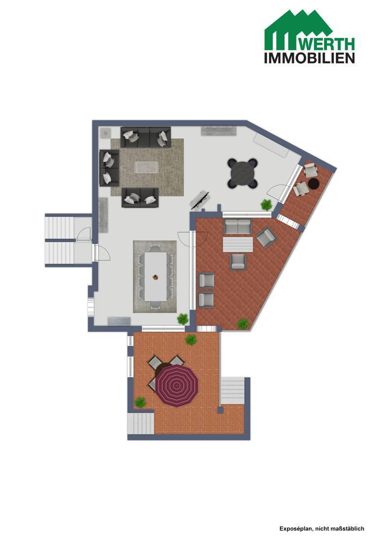 Terrassen und Balkone: Insgesamt ca. 100 m² an Terrassenflächen, darunter eine ca. 30 m² überdachte Wohnzimmerterrasse und eine ca. 8 m² große Dachterrasse, die vom Schlafzimmer aus begehbar ist.
