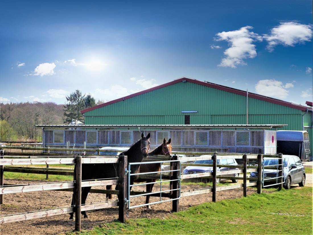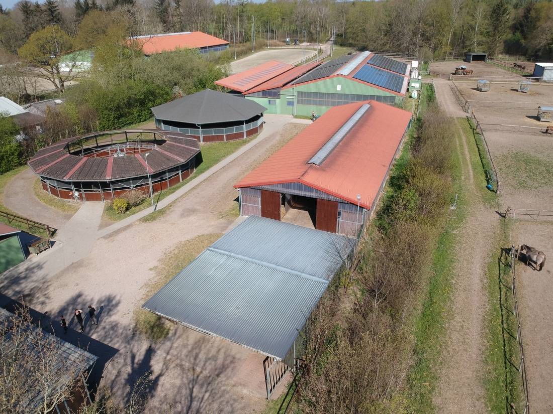 Auf dieser Fläche befindet sich ein Dressurplatz, ein Springplatz, eine Reithalle mit Lagerflächen, eine Bewegungshalle, mehrere Paddocks sowie eine überdachte Führmaschine und eine Longierhalle.