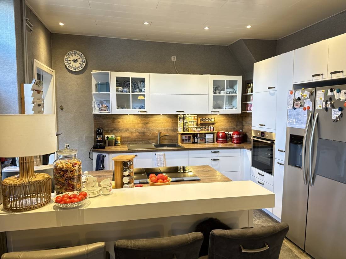 Die offene Küche mit ihrem stilvollen Tresen fügt sich harmonisch in ein und schafft durch das innovative Bora-Kochsystem einen modernen Touch. Direkt angrenzend befindet sich ein Hauswirtschaftsraum, der alles Notwendige bereithält.