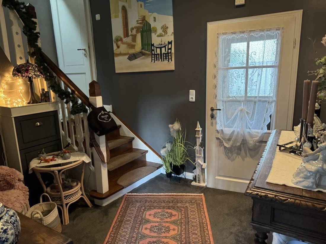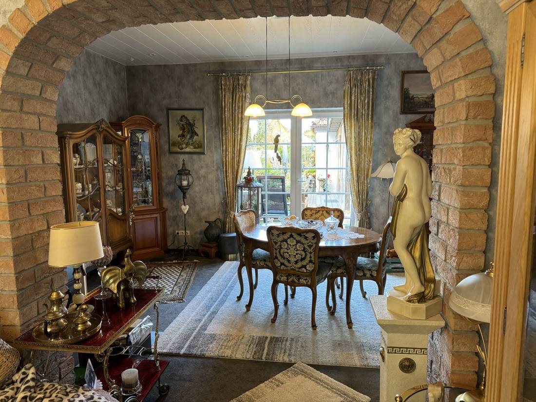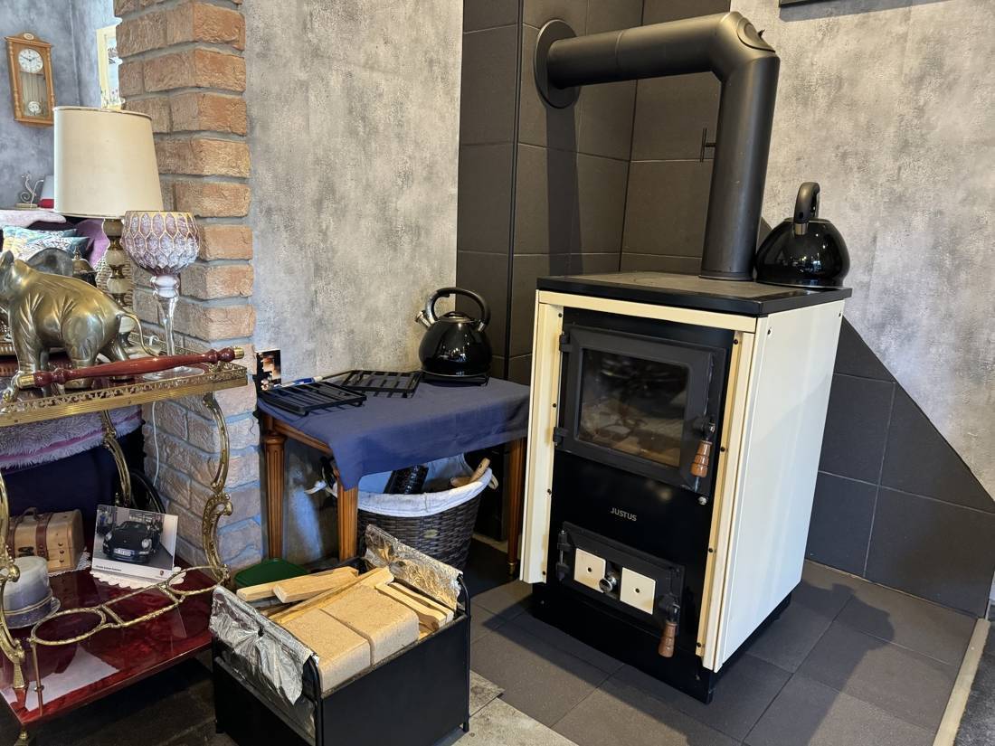 Das Herzstück des Esszimmers ist der imposante Kaminofen. Nicht nur sorgt er für wohlige Wärme an kühleren Tagen, er bietet auch die Möglichkeit, darauf zu kochen – ein echtes Highlight für alle, die das Besondere lieben. Dieser Kaminofen versorgt das gesamte Haus effizient mit Wärme und verleiht eine behagliche Atmosphäre. Das Warmwasser wird über einen Durchlauferhitzer bereitgestellt, was eine energiesparende Versorgung ermöglicht.
