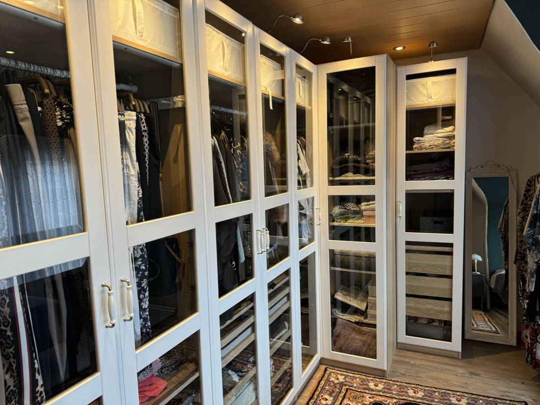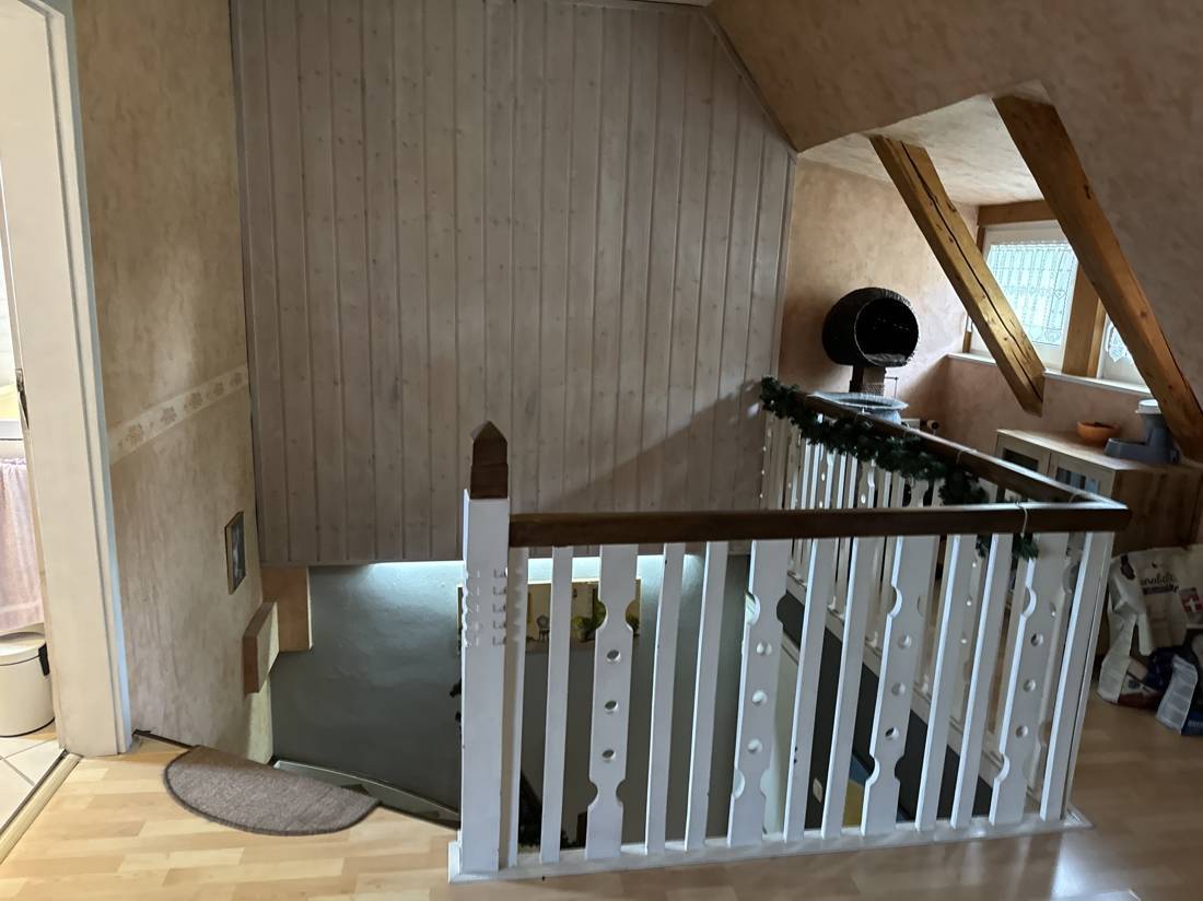 Die geschwungene Treppe im Flur führt in das Dachgeschoss. Dank der offenen Gestaltung wirkt der Flur im Dachgeschoss großzügig und pompös. Auf halber Höhe befindet sich ein kleines Gäste-WC. Das Dachgeschoss bietet zwei komfortable Zimmer, von denen eines als luxuriöses Ankleidezimmer genutzt wird, sowie ein Wannenbad.